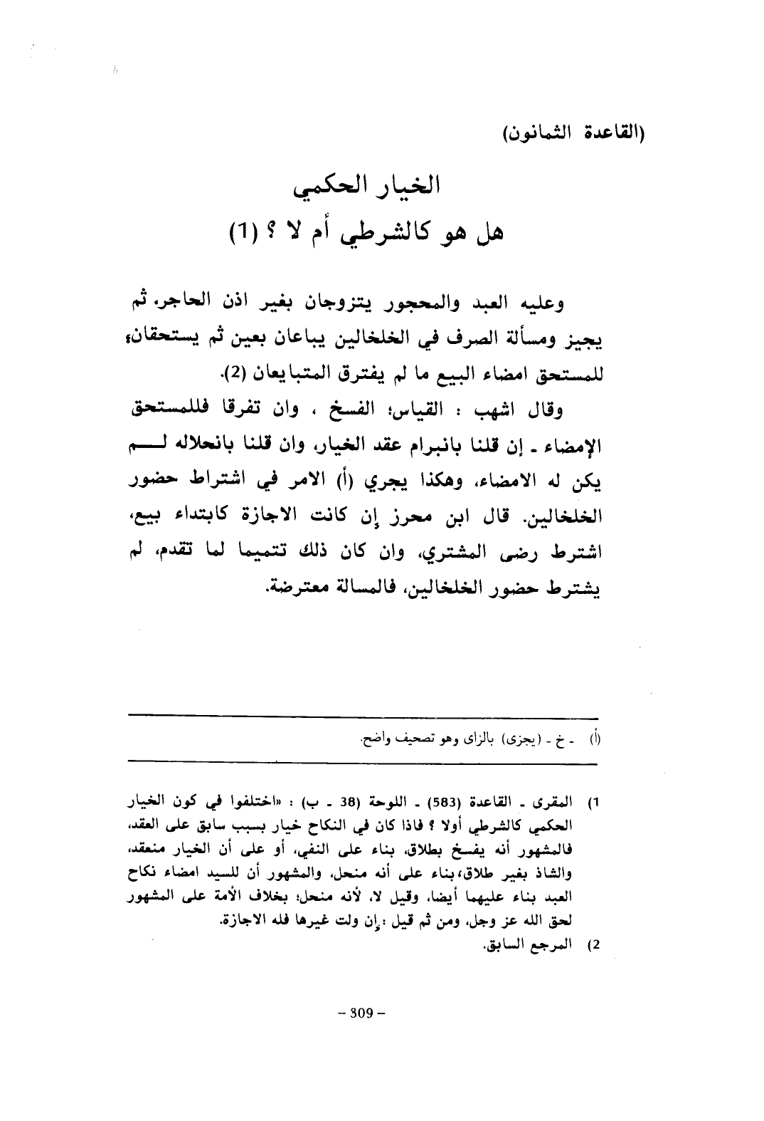 (1) المقري - القاعدة (583) - اللوحة (38 - ب): "اختلفوا في كون الخيار الحكمي كالشرطي أولًا؟ فإذا كان في النكاح خيار بسبب سابق على العقد، فالمشهور أنه يفسخ بطلاق، بناء على النفي، أو على أن الخيار منعقد، والشاذ بغير طلاق، بناء على أنه منحل، والمشهور أن للسيد إمضاء نكاح العبد بناء عليهما أيضًا، وكيل لا، لأنه منحل؛ بخلاف الأمة على المشهور لحق الله عزَّ وجلَّ، ومن ثم قيل: إن ولت غيرها فله الإجازة.