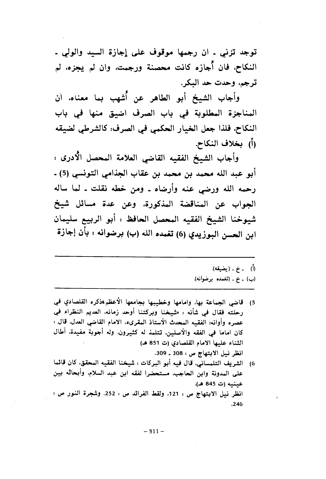 وأجاب الشيخ الفقيه القاضي العلامة المحصل الأدرى: أبو عبد الله محمد بن محمد بن عقاب الجذامي التونسي (¬5) - رحمه الله ورضي عنه وأرضاه - ومن خطه نقلت - لما سأله الجواب عن المناقضة المذكورة، وعن عدة مسائل شيخ شيوخنا الشيخ الفقيه المحصل الحافظ: أبو الربيع سليمان بن الحسن البوزيدي (¬6) تغمده الله (ب) برضوانه: بأن إجازة