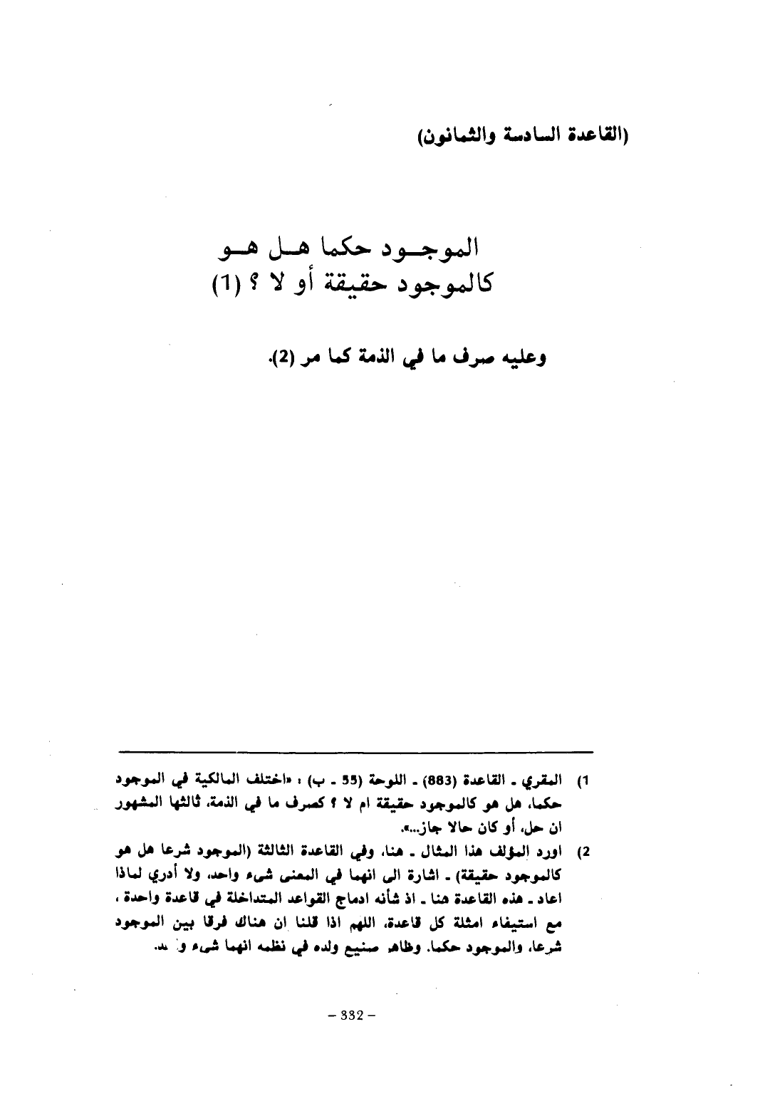 (¬1) المقري. القاعدة (883) - اللوحة (55 - ب)، "اختلف المالكية في الموجود حكما، هل هو كالموجود حقيقة أم لا؟ كصرف ما في الذمة، ثالثها المشهور أن حل، أو كان حالا جاز.؟ .