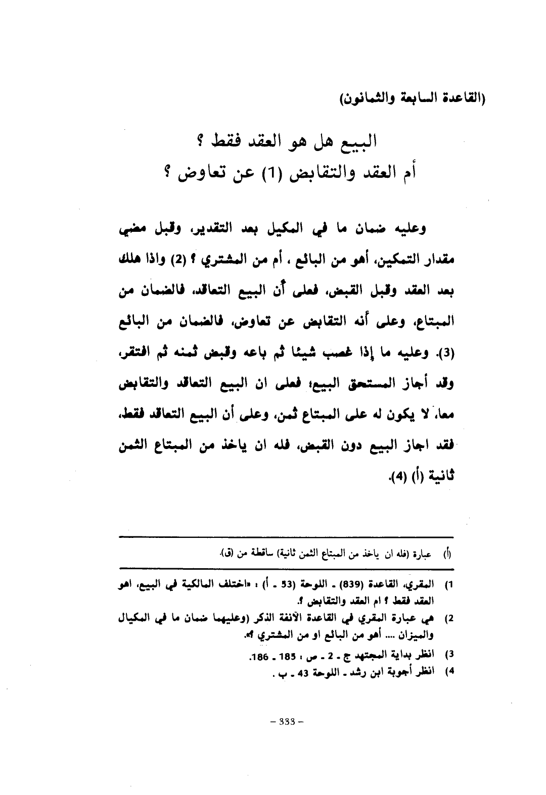 (¬1) المقري، القاعدة (839) - اللوحة (53 - أ): "اختلف إلى المالكية في البيع، أهو العقد فقط؟ أم العقد والتقابض؟ .
