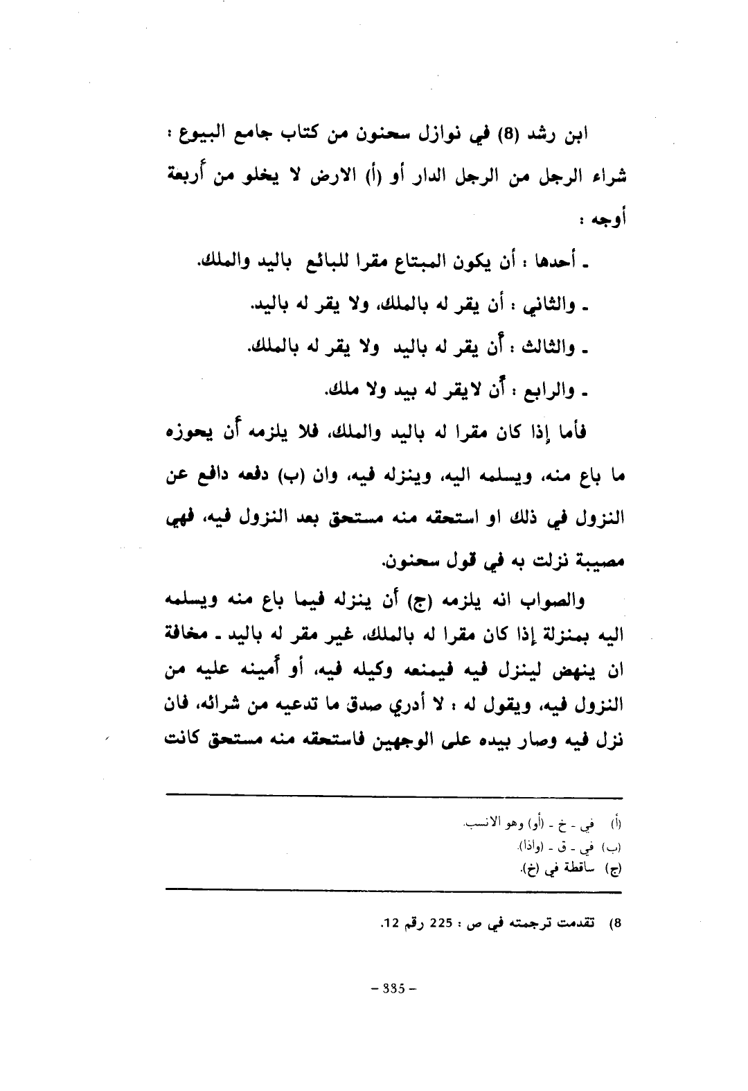 ابن رشد (8) في نوازل سحنون من كتاب جامع البيوع: شراء الرجل من الرجل الدار أو (أ) الأرض لا يخلو من أربعة أوجه: