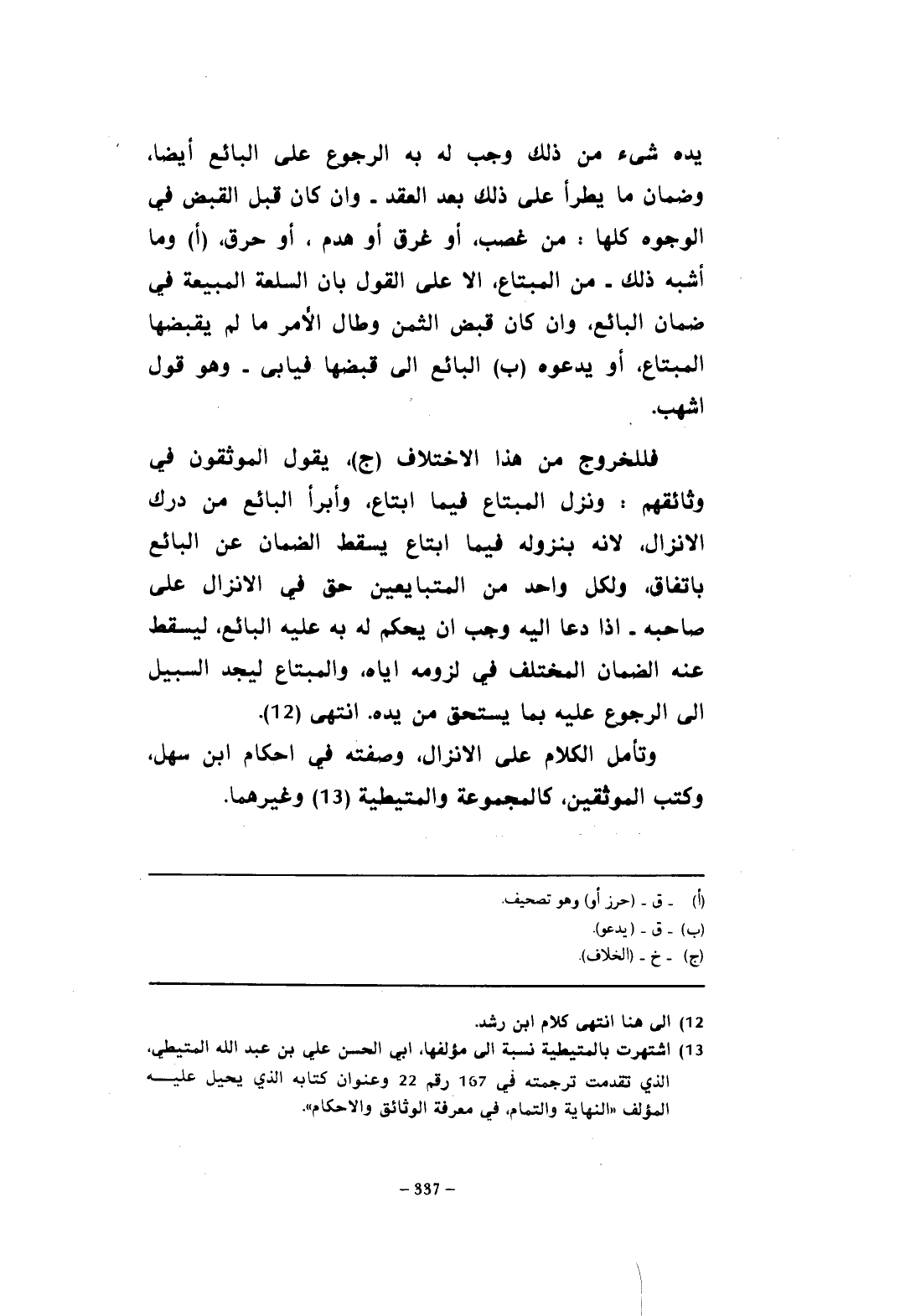 فللخروج من هذا الاختلاف (ج)، يقول الموثقون في وثائقهم: ونزل المبتاع فيما ابتاع، وأبرأ البائع من درك الإنزال، لأنه بنزوله فيما ابتاع يسقط الضمان عن البائع باتفاق، ولكل واحد من المتبايعين حق في الإنزال على صاحبه. إذا دعا إليه وجب أن يحكم له به عليه البائع، ليسقط عنه الضمان المختلف في لزومه إياه، والمبتاع ليجد السبيل إلى الرجوع عليه بما يستحق من يده. انتهى (¬12).