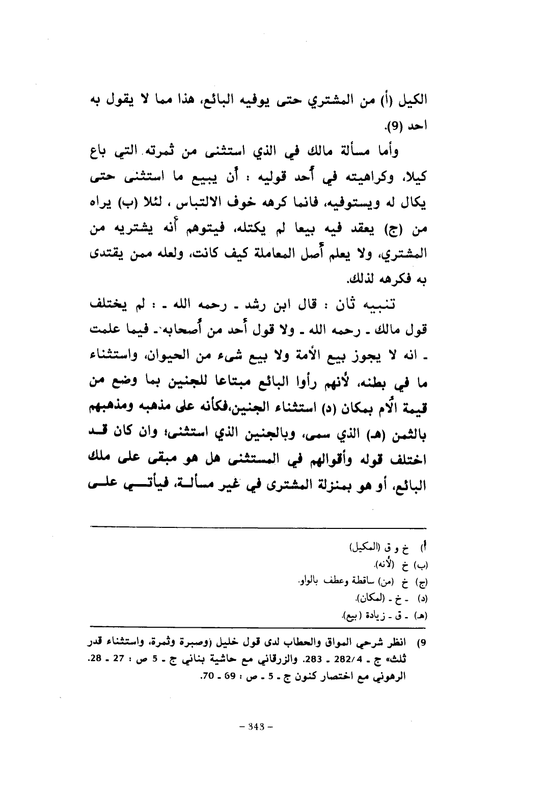 (¬9) انظر شرحي المواق والحطاب لدى قول خليل (وصبرة وثمرة، واستثناء قدر ثلث" ج - 4/ 282 - 283. والزرقاني مع حاشية بناني ج - 5 ص: 27 - 28. الرهوني مع اختصار كنون ج - 5 - ص: 69 - 70.