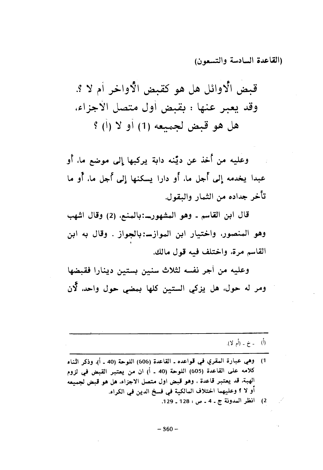 (¬1) وهي عبارة المقري في قواعده - القاعدة (606) اللوحة (40 - أ)، وذكر أثناء كلامه على القاعدة (605) اللوحة (40 - أ) أن من يعتبر القبض في لزوم الهبة، قد يعتبر قاعدة، وهو قبض أول متصل الأجزاء، هل هو قبض لجميعه أو لا؟ وعليهما اختلاف المالكية في فسخ الدين في الكراء.