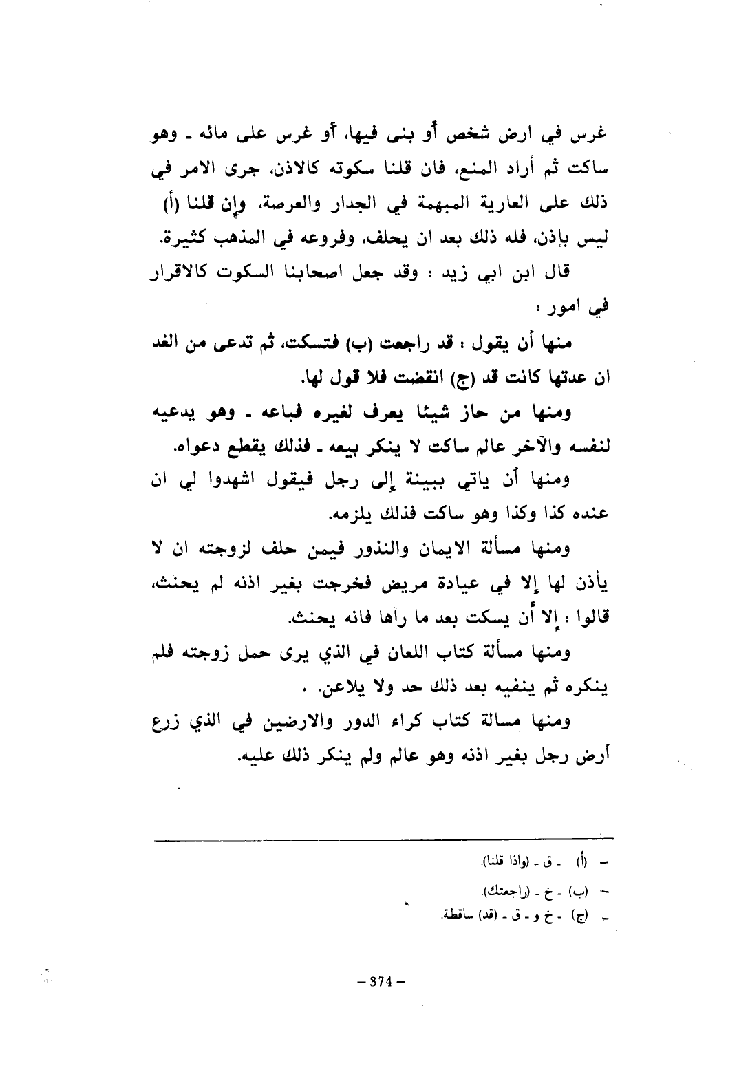 منها أن يقول: قد راجعت (ب) فتسكت، ثم تدعى من الغد أن عدتها كانت قد (ج) انقضت فلا قول لها.