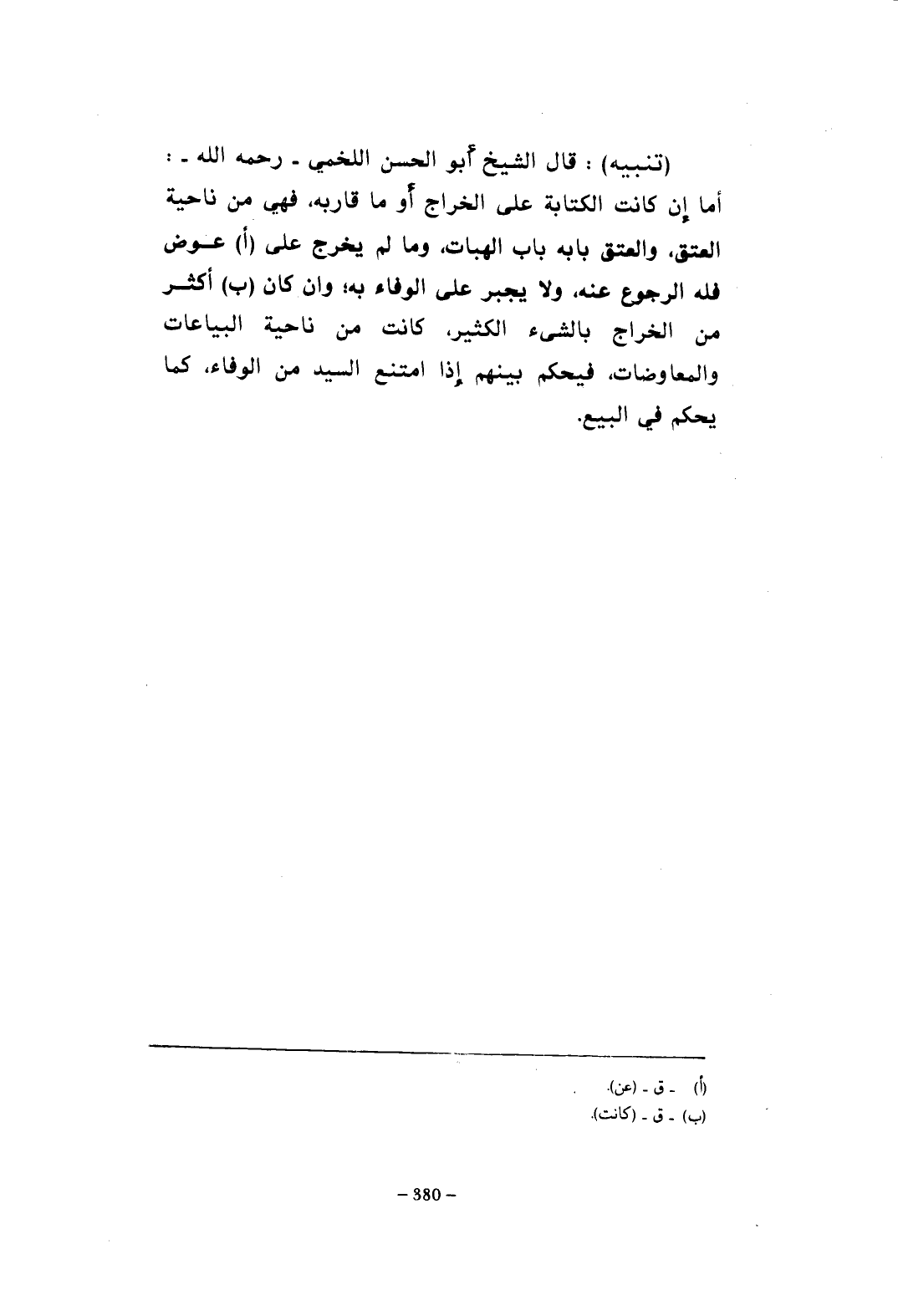 (تنبيه): قال الشيخ أبو الحسن اللخمي -رحمه الله-: أما إن كانت الكتابة على الخراج أو ما قاربه، فهي من ناحية العتق، والعتق بابه باب الهبات، وما لم يخرج على (أ) عوض فله الرجوع عنه، ولا يجبر على الوفاء به؛ وإن كان (ب) أكثر من الخراج بالشئ الكثير، كانت من ناحية البياعات والمعاوضات، فيحكم بينهم إذا امتنع السيد من الوفاء، كما يحكم في البيع.