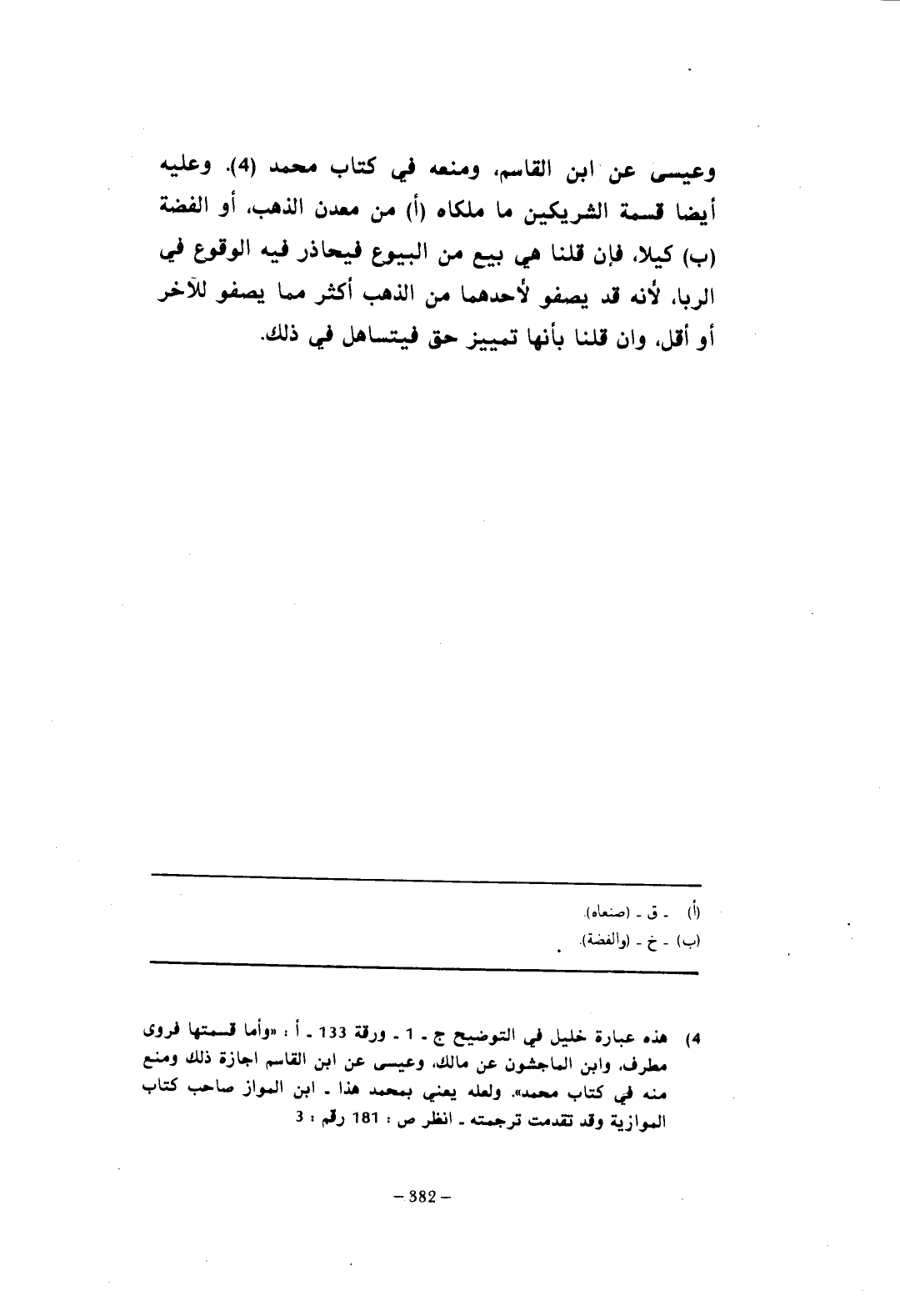 (¬4) هذه عبارة خليل في التوضيح ج -1 - ورقة 133 - أ: "وأما قسمتها فروى مطرف، وابن الماجشون عن مالك، وعيسى عن ابن القاسم إجازة ذلك ومنع منه في كتاب محمد". ولعله يعني بمحمد هذا - ابن المواز صاحب كتاب الموازية وقد تقدمت ترجمته - انظر ص: 181 رقم: 3.