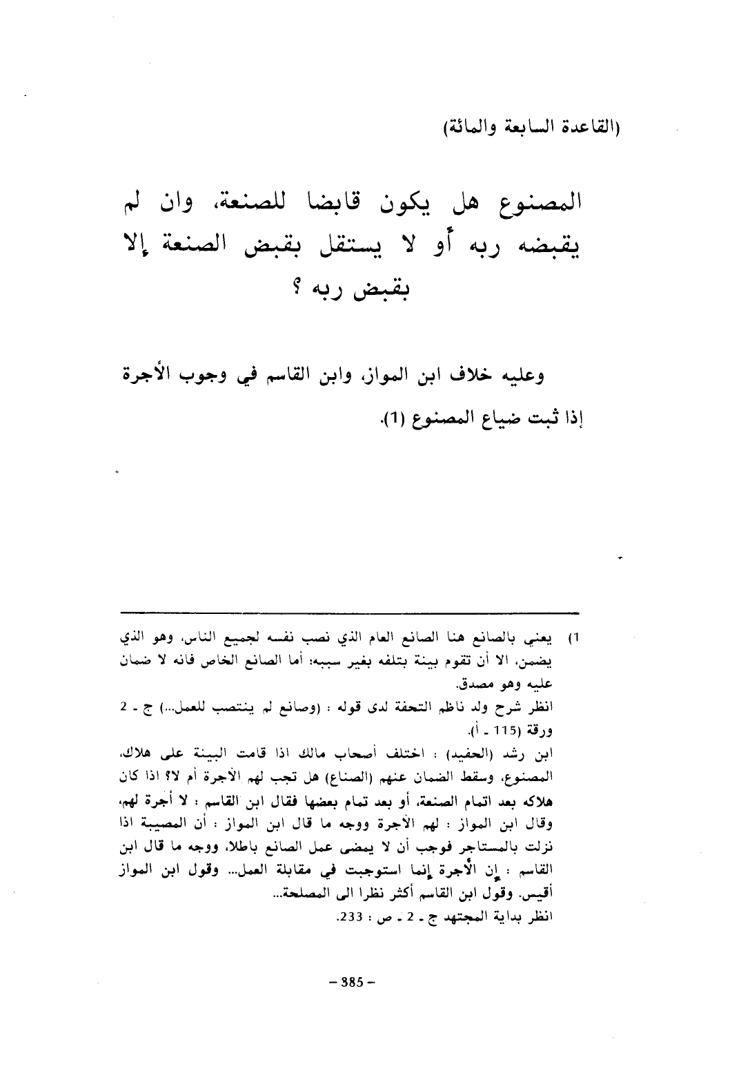 ابن رشد (الحفيد): اختلف أصحاب مالك إذا قامت البينة على هلاك، المصنوع، وسقط الضمان عنهم (الصناع) هل تجب لهم الأجرة أم لا؟ إذا كان هلاكه بعد إتمام الصنعة، أو بعد تمام بعضها فقال ابن القاسم: لا أجرة لهم، وقال ابن المواز: لهم الأجرة ووجه ما قال ابن المواز: أن المصيبة إذا نزلت بالمستاجر فوجب أن لا يمضى عمل الصانع باطلا، ووجه ما قال ابن القاسم: أن الأجرة إنما استوجبت في مقابلة العمل ... وقول ابن المواز أقيس. وقول ابن القاسم أكثر نظرا إلى المصلحة ...