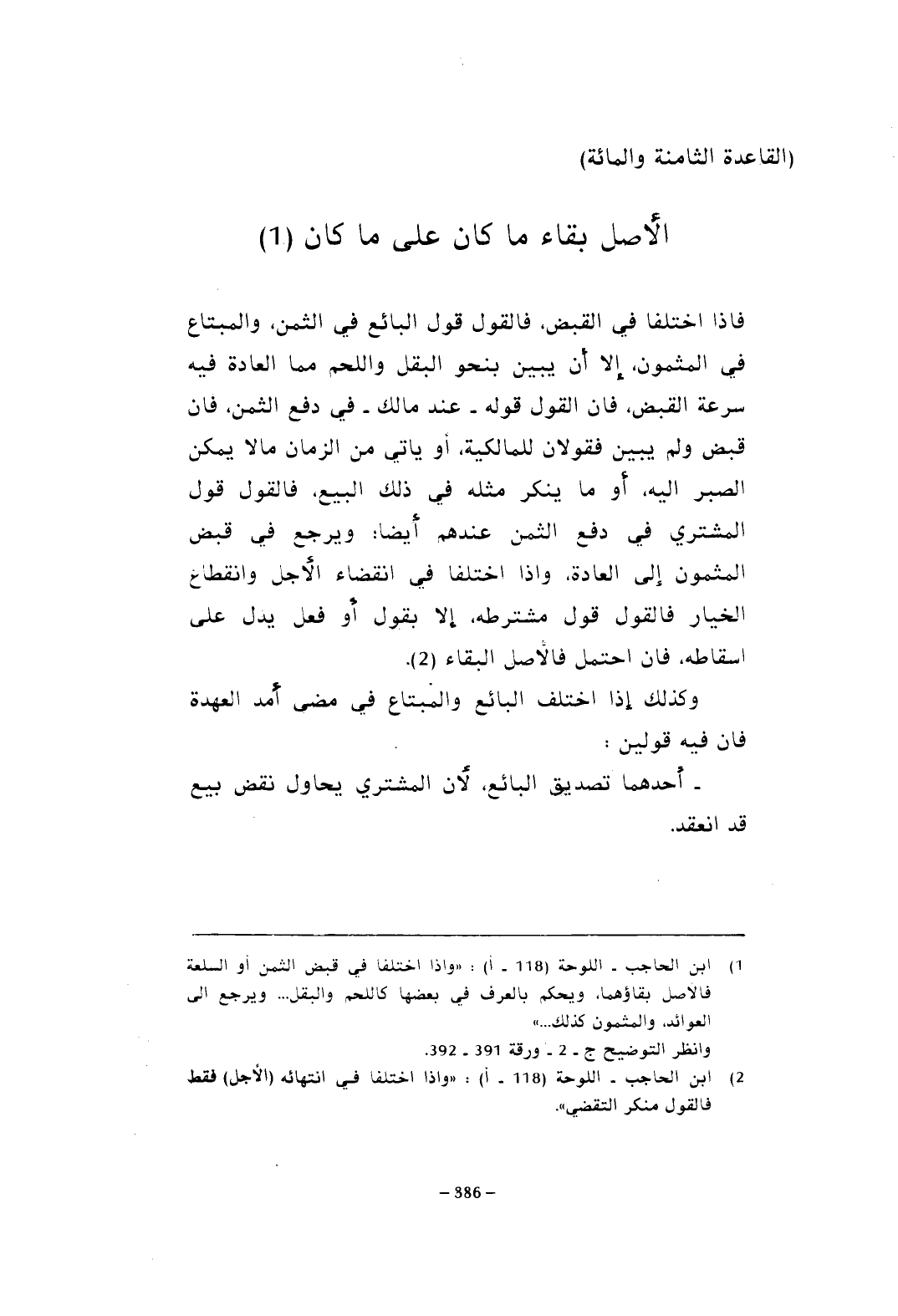 (¬1) ابن الحاجب - اللوحة (118 - أ): "وإذا اختلفا في قبض الثمن أو السلعة فالأصل بقاؤهما، ويحكم بالعرف في بعضها كاللحم والبقل ... ويرجع إلى العواند، والمثمون كذلك ... "