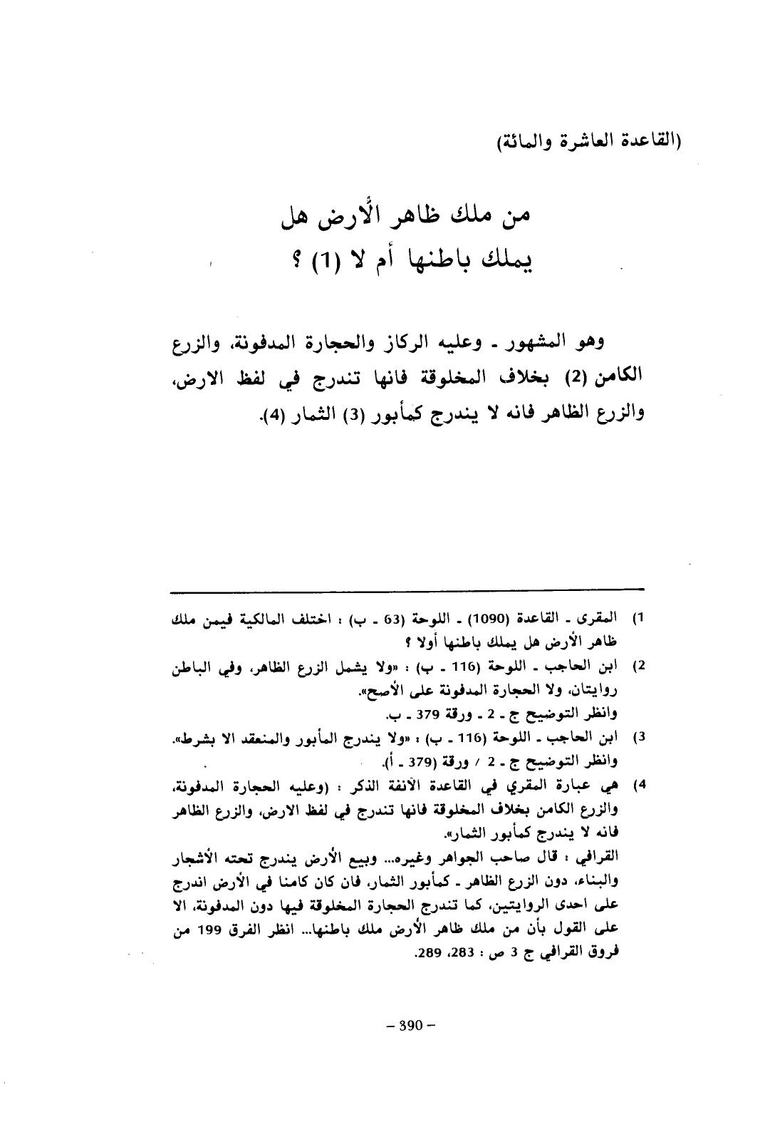 القرافي: قال صاحب الجواهر وغيره ... وبيع الأرض يندرج تحته الأشجار والبناء، دون الزرع الظاهر - كمأبور الثمار، فإن كان كامنا في الأرض اندرج على إحدى الروايتين، كما تندرج الحجارة المخلوقة فيها دون المدفونة، إلا على القول بأن من ملك ظاهر الأرض ملك باطنها ... انظر الفرق 199 من فروق القرافي ج 3 ص: 283، 289.