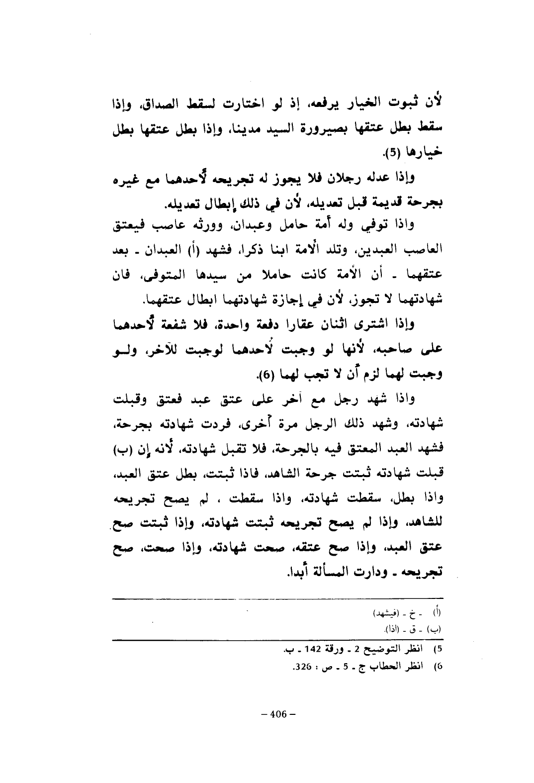 وإذا شهد رجل مع آخر علي عتق عبد فعتق وقبلت شهادته، وشهد ذلك الرجل مرة أخرى، فردت شهادته بجرحة، فشهد العبد المعتق فيه بالجرحة، فلا تقبل شهادته، لأنه إن (ب) قبلت شهادته ثبتت جرحة الشاهد، فإذا ثبتت، بطل عتق العبد، وإذا بطل، سقطت شهادته، وإذا سقطت، لم يصح تجريحه للشاهد، وإذا لم يصح تجريحه ثبتت شهادته، وإذا ثبتت صح عتق العبد، وإذا صح عتقه، صحت شهادته، وإذا صحت، صح تجريحه- ودارت المسألة أبدا.