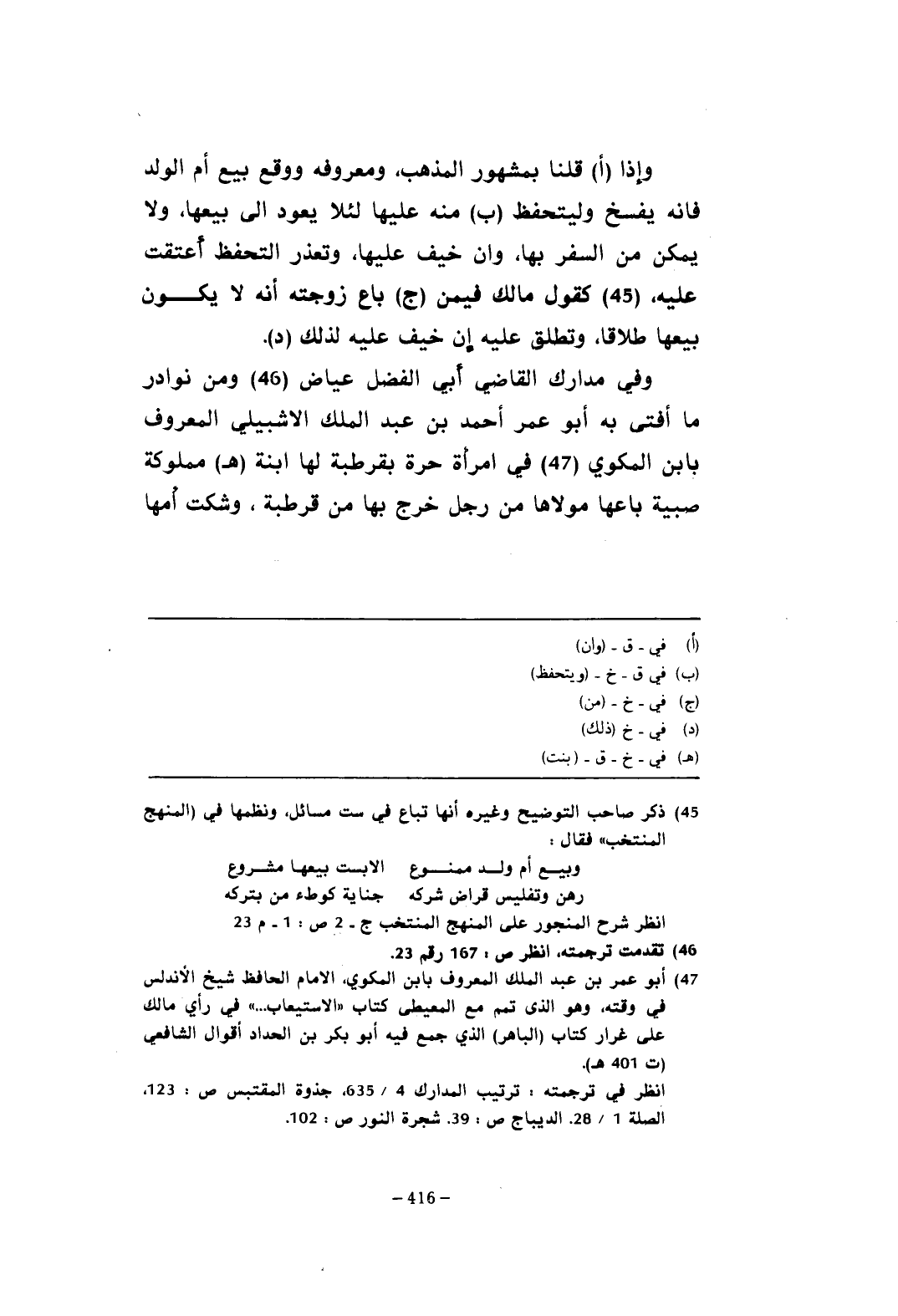 وإذا (أ) قلنا بمشهور المذهب، ومعروفه ووقع بيع أم الولد فإنه يفسخ وليتحفظ (ب) منه عليها لئلا يعود الي بيعها، ولا يمكن من السفر بها، وإن خيف عليها، وتعذر التحفظ أعتقت عليه، (¬45) كقول مالك ليمن (ج) باع زوجته أنه لا يكون بيعها طلاقا، وتطلق عليه إن خيف عليه لذلك (د).