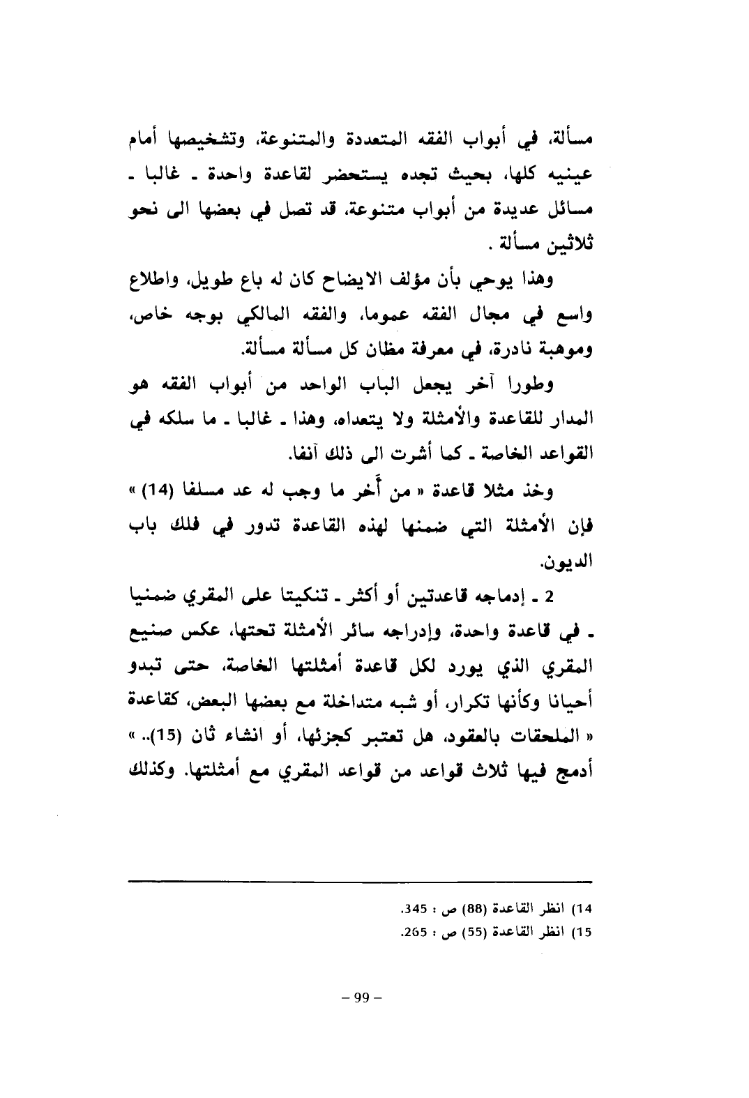 2 - إدماجه قاعدتين أو أكثر- تنكيتا علي المقري ضمنيا - في قاعدة واحدة، وإدراجه سائر الأمثلة تحتها، عكس صنيع المقري الذي يورد لكل قاعدة أمثلتها الخاصة، حتى تبدو أحيانا وكأنها تكرار، أو شبه متداخلة مع بعضها البعض، كقاعدة "الملحقات بالعقود، هل تعتبر كجزئها، أو إنشاء ثان (¬15) .. " أدمج فيها ثلاث قواعد من قاعد المقري مع أمثلتها. وكذلك