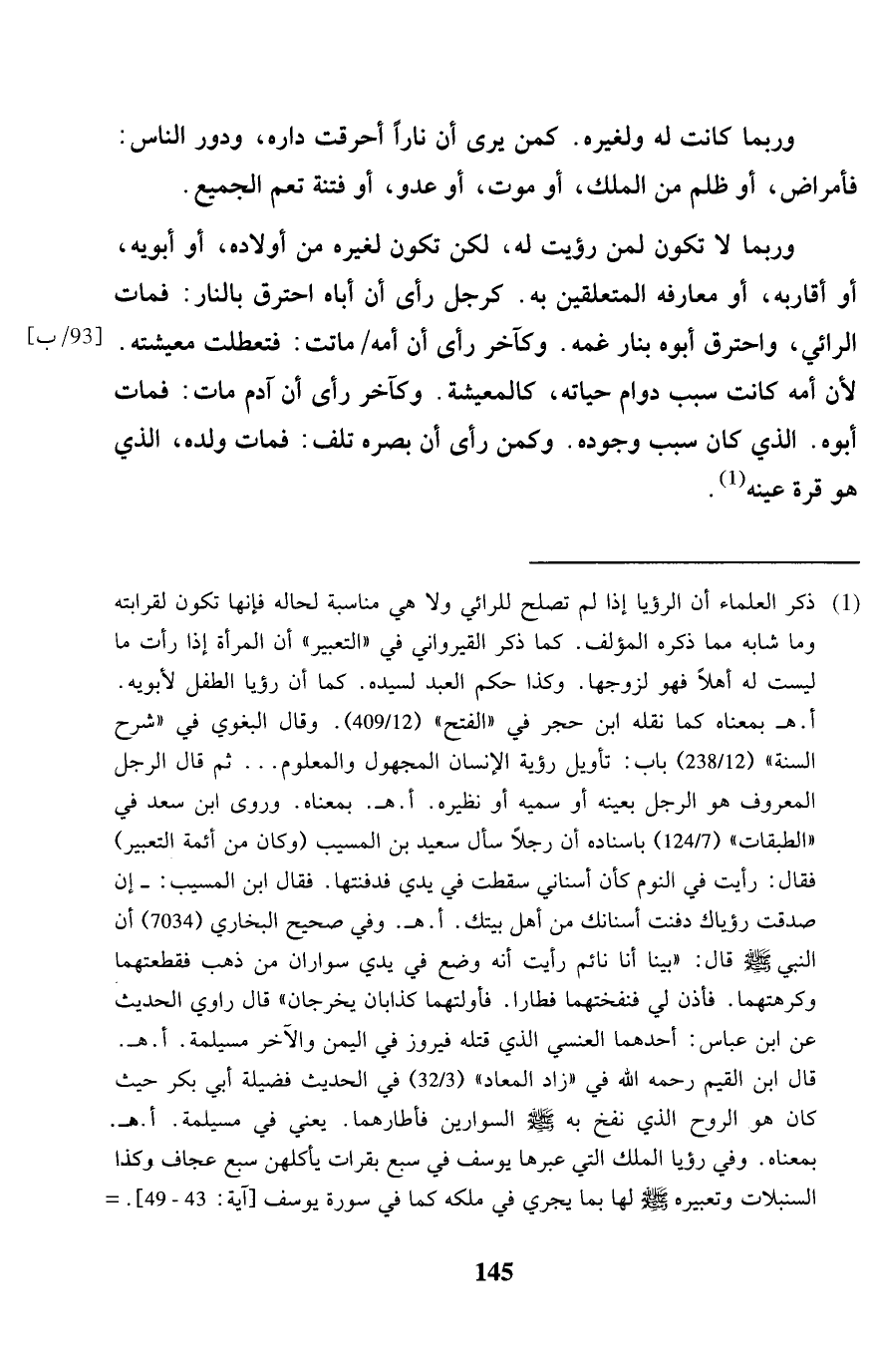 وَرُبمَا كَانَت لَهُ وَلغيره. كمن يرى أَن نَارا أحرقت دَاره، ودور النَّاس: فأمراض، أَو ظلم من املك، أَو موت، أَو عَدو، أَو فتْنَة تعم الْجَمِيع. وَرُبمَا لَا تكون لمن رؤيت لَهُ، لَكِن تكون لغيره من أَوْلَاده، أَو أَبَوَيْهِ، أَو أَقَاربه، أَو معارفه المتعلقين بِهِ. كَرجل رأى أَن أَبَاهُ احْتَرَقَ بالنَّار: فَمَاتَ الرَّائِي، وَاحْتَرَقَ أَبوهُ بِنَار غمه. وكآخر رأى أَن أمه / مَاتَت: فتعطلت معيشته. لِأَنَّهُ أمه كَانَت سَبَب دوَام حَيَاته، كالمعيشة. وكآخر رأى أَن آدم مَاتَ: فَمَاتَ أَبوهُ. الَّذِي كَانَ سَبَب وجوده. وَكَمن رأى أَن بَصَره تلف: فَمَاتَ وَلَده، الَّذِي هُوَ قُرَّة عينه.
