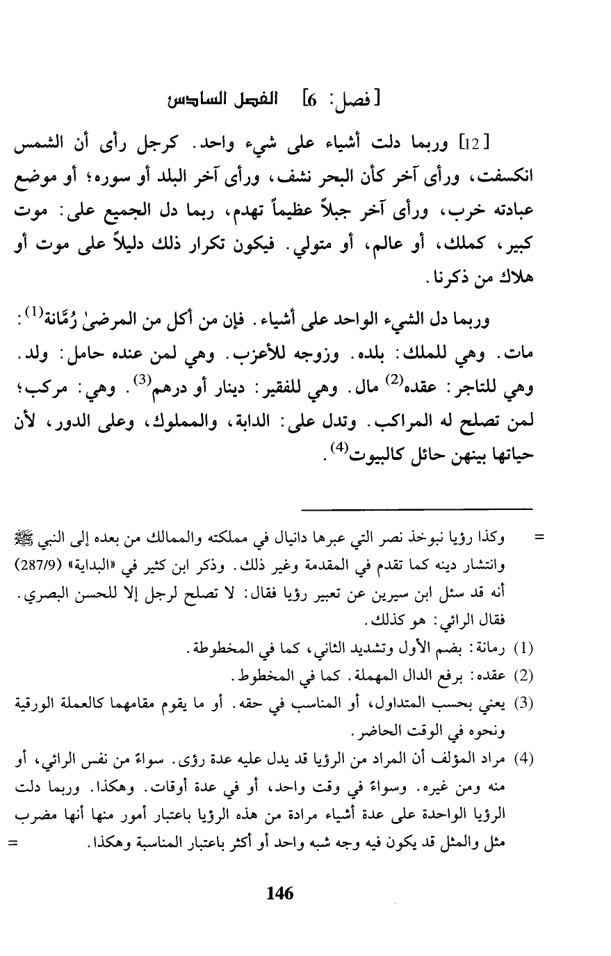 [12] وَرُبمَا دلّت أَشْيَاء على شَيْء وَاحِد. كَرجل رأى أَن الشَّمْس انكسفت، وَرَأى آخر كَأَن الْبَحْر نشف، وَرَأى آخر الْبَلَد أَو سُورَة؛ أَو مَوضِع عِبَادَته خرب، وَرَأى آخر جبلا عَظِيما تهدم، رُبمَا دلّ الْجَمِيع على: موت كَبِير، كملك، أَو عَالم، أَو مُتَوَلِّي. فَيكون تكْرَار ذَلِك دَلِيلا على موت أَو هَلَاك من ذكرنَا. وَرُبمَا دلّ الشَّيْء الْوَاحِد على أَشْيَاء. فَإِن من أكل من المرضى رمانة: مَاتَ. وَهِي للْملك: بَلَده. وزوجه للأعزب. وَهِي لمن عِنْده حَامِل: ولد. وَهِي للتاجر: عقده مَال. وَهِي للْفَقِير: دِينَار أَو دِرْهَم. وَهِي: مركب؛ لمن تصلح لَهُ المراكب. وتدل على: الدَّابَّة، والمملوك، وعَلى الدّور، لِأَن حَيَاتهَا بَينهُنَّ حَائِل كالبيوت.