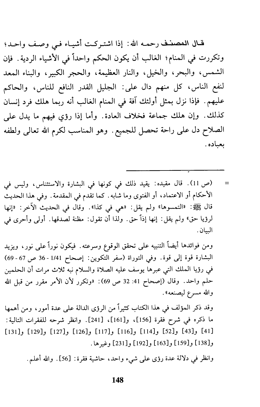 قَالَ المُصَنّف رَحمَه الله: إِذا اشتركت أَشْيَاء فِي وصف وَاحِد؛ وتكررت فِي الْمَنَام؛ الْغَالِب أَن يكون الحكم وَاحِدًا فِي الْأَشْيَاء الردية. فَإِن الشَّمْس، وَالْبَحْر، وَالْخَيْل، وَالنَّار الْعَظِيمَة، وَالْحجر الْكَبِير، وَالْبناء الْمعد لنفع النَّاس، كل مِنْهُم دَال على: الْجَلِيل الْقدر النافع للنَّاس، وَالْحَاكِم عَلَيْهِم. فَإِذا نزل بِمثل أُولَئِكَ آفَة فِي الْمَنَام الْغَالِب أَنه رُبمَا هلك فَرد إِنْسَان كَذَلِك. وَإِن هلك جمَاعَة فخلاف الْعَادة. وَأما إِذا رُؤِيَ فيهم مَا يدل على الصّلاح دلّ على رَاحَة تحصل للْجَمِيع. وَهُوَ الْمُنَاسب لكرم الله تَعَالَى ولطفه بعباده.