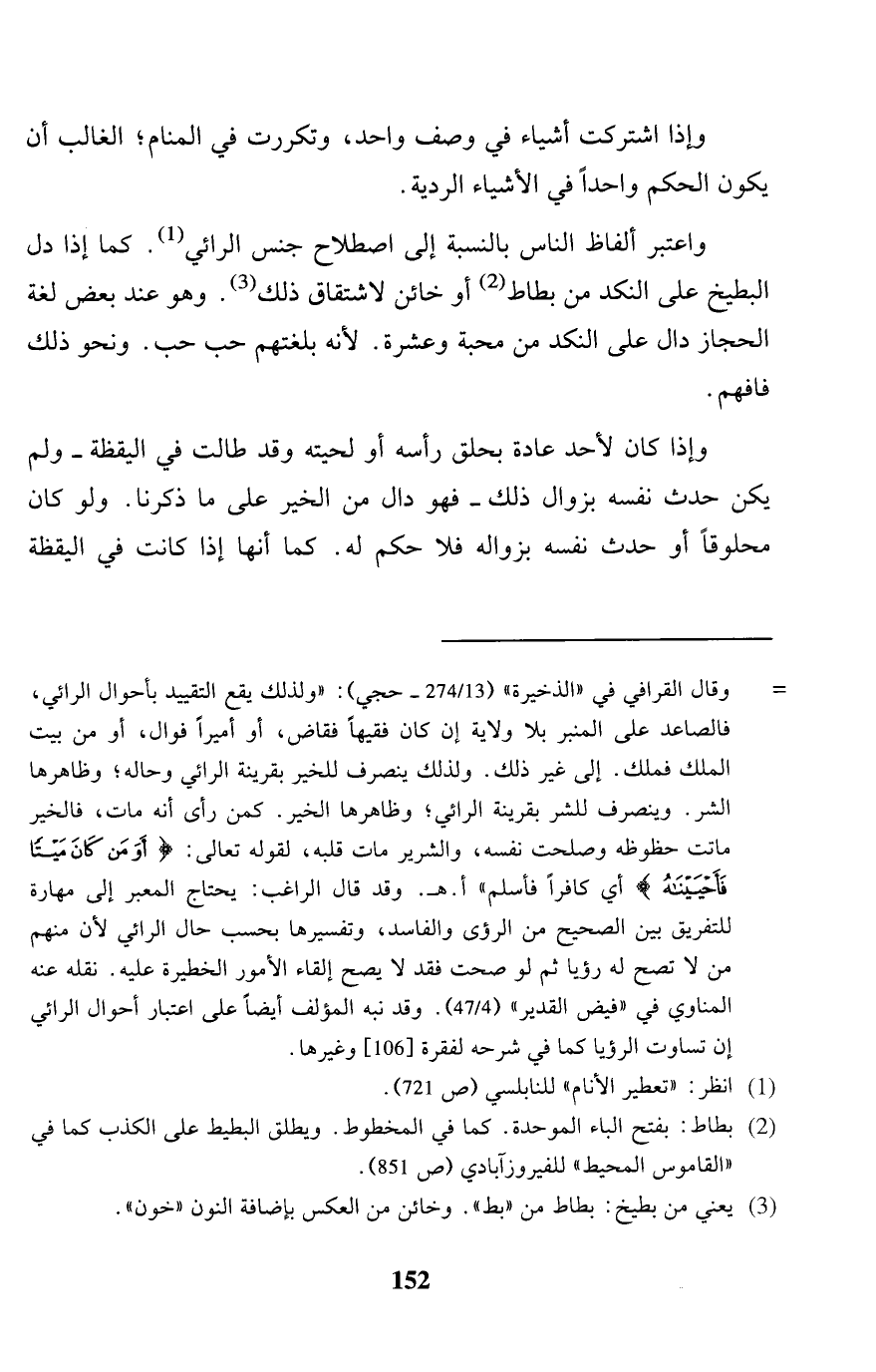 وَإِذا اشتركت أَشْيَاء فِي وصف وَاحِد، وتكررت فِي الْمَنَام؛ الْغَالِب أَن يكون الحكم وَاحِدًا فِي الْأَشْيَاء الردية. وَاعْتبر أَلْفَاظ النَّاس بِالنِّسْبَةِ إِلَى اصْطِلَاح جنس الرَّائِي. كَمَا إِذا دلّ الْبِطِّيخ على النكد من بطاط أَو خائن لاشتقاق ذَلِك. وَهُوَ عِنْد بعض لُغَة الْحجاز دَال على النكد من محبَّة وَعشرَة. لِأَنَّهُ بلغتهم حب حب. وَنَحْو ذَلِك فَافْهَم. وَذَا كَانَ لأحد عَادَة بحلق رَأسه أَو لحيته وَقد طَالَتْ فِي الْيَقَظَة - وَلم يكن حدث نَفسه بِزَوَال ذَلِك - فَهُوَ دَال من الْخَيْر على مَا ذكرنَا. وَلَو كَانَ محلوقاً أَو حدث نَفسه بزواله فَلَا حكم لَهُ. كَمَا أَنَّهَا إِذا كَانَت فِي الْيَقَظَة