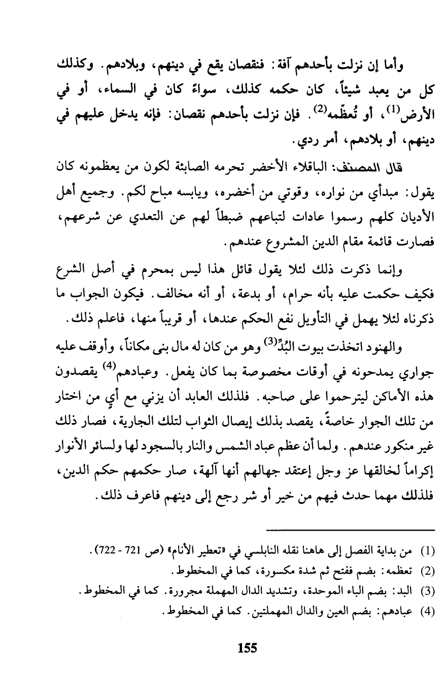 وَأما إِن نزلت بأحدهم آفَة: فنقصان يَقع فِي دينهم، وبلادهم. وَكَذَلِكَ كل من يعبد شَيْئا، كَانَ حكمه كَذَلِك، سَوَاء كَانَ فِي السَّمَاء، أَو فِي الأَرْض، أَو تعظمه. فَإِن نزلت بأحدهم نُقْصَان: فَإِنَّهُ يدْخل عَلَيْهِم فِي دينهم، أَو بِلَادهمْ، أَمر ردي. قَالَ المُصَنّف: الباقلاء الْأَخْضَر تحرمه الصائبة لكَون من يعظمونه كَانَ يَقُول: مبدأي من نواره، وقوتي من أخضره، ويابسه مُبَاح لكم. وَجَمِيع أهل الْأَدْيَان كلهم رسموا عادات لتباعهم ضبطاً لَهُم عَن التَّعَدِّي عَن شرعهم، فَصَارَت قَائِمَة مقَام الدّين الْمَشْرُوع عِنْدهم. وَإِنَّمَا ذكر ذَلِك لِئَلَّا يَقُول قَائِل هَذَا لَيْسَ بِمحرم فِي أصل الشَّرْع فَكيف حكمت عَلَيْهِ بِأَنَّهُ حرَام، أَو بِدعَة، أَو أَنه مُخَالف. فَيكون الْجَواب مَا ذَكرْنَاهُ لِئَلَّا يهمل فِي التَّأْوِيل نفع الحكم عِنْدهَا، أَو قَرِيبا مِنْهَا، فَاعْلَم ذَلِك. والهنود اتَّخذت بيُوت البد وَهُوَ من كَانَ لَهُ مَال بنى مَكَانا، وأوقف عَلَيْهِ جواري يمدحونه فِي أَوْقَات مَخْصُوصَة بِمَا كَانَ يفعل. وعبادهم يقصدون هَذِه الْأَمَاكِن ليترحموا على صَاحبه. فَلذَلِك العابد أَن يَزْنِي مَعَ أَي من اخْتَار من تِلْكَ الْجوَار خَاصَّة، يقْصد بذلك إِيصَال الثَّوَاب لتِلْك الْجَارِيَة، فَصَارَ ذل غير منكور عِنْدهم. وَلما أَن عظم عباد الشَّمْس وَالنَّار بِالسُّجُود لَهَا ولسائر الْأَنْوَار إِكْرَاما لخالقها عز وَجل إعتقد جهالهم أَنَّهَا آلِهَة، صَار حكمهم حكم الدّين، فَلذَلِك مِمَّا حدث فيهم من خير أَو شَرّ رَجَعَ إِلَى دينهم فاعرف ذَلِك.