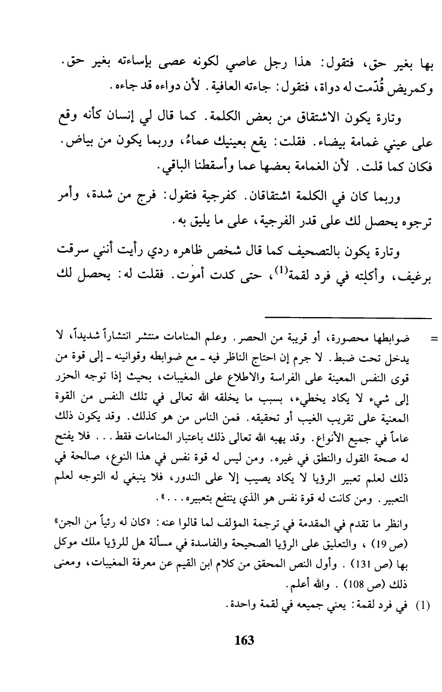 بهَا بِغَيْر حق، فَتَقول: هَذَا رجل عاصي لكَونه عصى بإساءته بِغَيْر حق. وكمريض قدمت لَهُ دَوَاة، فَتَقول: جَاءَتْهُ الْعَافِيَة. لِأَن دواءه قد جَاءَهُ. وَتارَة يكون الِاشْتِقَاق من بعض الْكَلِمَة. كَمَا قَالَ لي إِنْسَان كَأَنَّهُ وَقع على عَيْني غمامة بَيْضَاء. فَقلت: يَقع بِعَيْنَيْك عماءُ، وَرُبمَا يكون من بَيَاض. فَكَانَ كَمَا قلت. لِأَن الغمامة بَعْضهَا عَمَّا وأسقطنا الْبَاقِي. وَرُبمَا كَانَ فِي الْكَلِمَة اشتقاقان. كفرجية فَتَقول: فرج من شدَّة، وَأمر ترجوه يحصل لَك على قدر الفرجية، على مَا يَلِيق بِهِ. وَتارَة يكون بالتصحيف كَمَا قَالَ شخص ظَاهره ردي رَأَيْت أنني سرقت برغيف، وأكلته فِي فَرد لقْمَة، حَتَّى كدت أَمُوت. فَقلت لَهُ: يحصل لَك