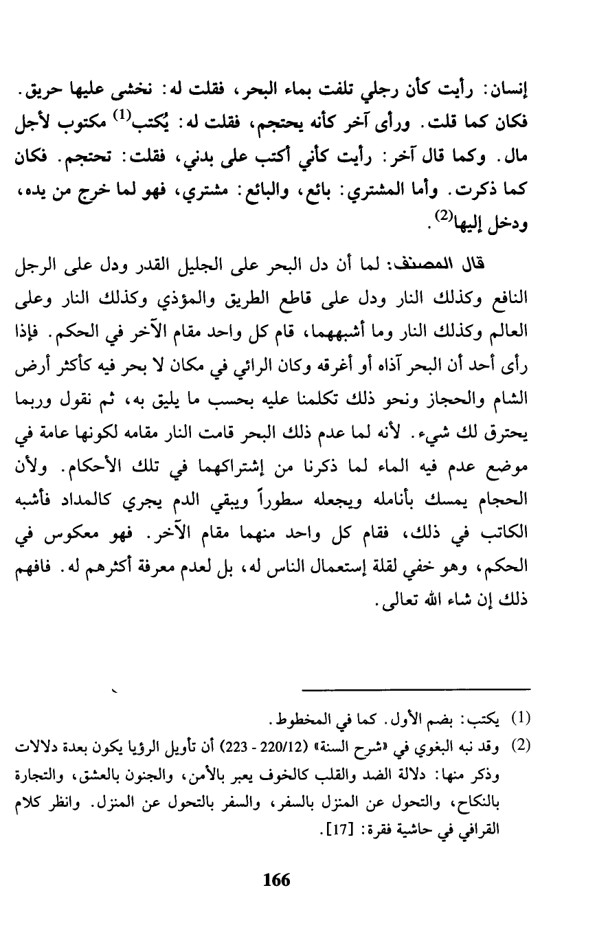 إِنْسَان: رَأَيْت كَأَن رجْلي تلفت بِمَاء الْبَحْر، فَقلت لَهُ: نخشى عَلَيْهَا حريق. فَكَانَ كَمَا قلت. وَرَأى آخر كَأَنَّهُ يحتجم، فَقلت لَهُ: يكْتب مَكْتُوب لأجل مَال. وكما قَالَ آخر: رَأَيْت كَأَنِّي أكتب على بدني، فَقلت: تحتجم. فَكَانَ كَمَا ذكرت. وَأما المُشْتَرِي: بَائِع، وَالْبَائِع: مُشْتَرِي، فَهُوَ لما خرج من يَده وَدخل إِلَيْهَا. قَالَ المُصَنّف: لما أَن دلّ الْبَحْر على الْجَلِيل الْقدر وَدلّ على الرجل النافع وَكَذَلِكَ النَّار وَدلّ على قَاطع الطَّرِيق والمؤذي وَكَذَلِكَ النَّار وعَلى الْعَالم وَكَذَلِكَ النَّار وَمَا أشبههما، قَامَ كل وَاحِد مقَام الآخر فِي الحكم. فَإِذا رأى أحد أَن الْبَحْر آذاه أَو أغرقه وَكَانَ الرَّائِي فِي مَكَان لَا بَحر فِيهِ كأكثر أَرض الشَّام والحجاز وَنَحْو ذَلِك تكلمنا عَلَيْهِ بِحَسب مَا يَلِيق بِهِ، ثمَّ نقُول وَرُبمَا يَحْتَرِق لَك شَيْء. لِأَنَّهُ لما عدم ذَلِك الْبَحْر قَامَت النَّار مقَامه لكَونهَا عَامَّة فِي مَوضِع عدم فيع المَاء لما ذكرنَا من إشتراكهما فِي تِلْكَ الْأَحْكَام. وَلِأَن الْحجام يمسك بأنامله ويجعله سطوراً وَيبقى الدَّم يجْرِي كالمداد فَأشبه الْكتاب فِي ذَلِك، فَقَامَ كل وَاحِد مِنْهُمَا مقَام الآخر. فَهُوَ معكوس فِي الحكم، وَهُوَ خَفِي لقلَّة اسْتِعْمَال النَّاس لَهُ، بل لعدم معرفَة أَكْثَرهم لَهُ. فَافْهَم ذَلِك إِن شَاءَ الله تَعَالَى.