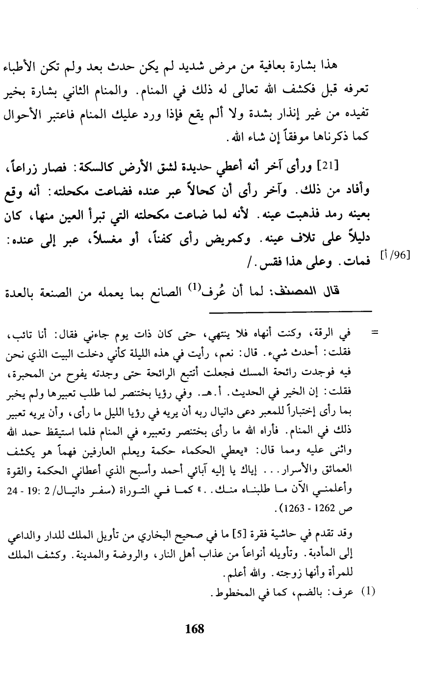 [21] وَرَأى آخر أَنه أعطي حَدِيدَة لشق الأَرْض كالسكة: فَصَارَ زراعاً، وَأفَاد من ذَلِك. وَآخر رأى أَن كحالاً عبر عِنْده فَضَاعَت مكحلته: أَنه وَقع بِعَيْنِه رمد فَذَهَبت عينه. لِأَنَّهُ لما ضَاعَت مكحلته الَّتِي تَبرأ الْعين مِنْهَا، كَانَ دَلِيلا على تلاف عينه. وكمريض رأى كنفاً، أَو مغسلاً، عبر إِلَى عِنْده: فَمَاتَ. وعَلى هَذَا فقس. / قَالَ المُصَنّف: لما أَن عرف الصَّانِع لما يعمله من الصَّنْعَة بالعدة