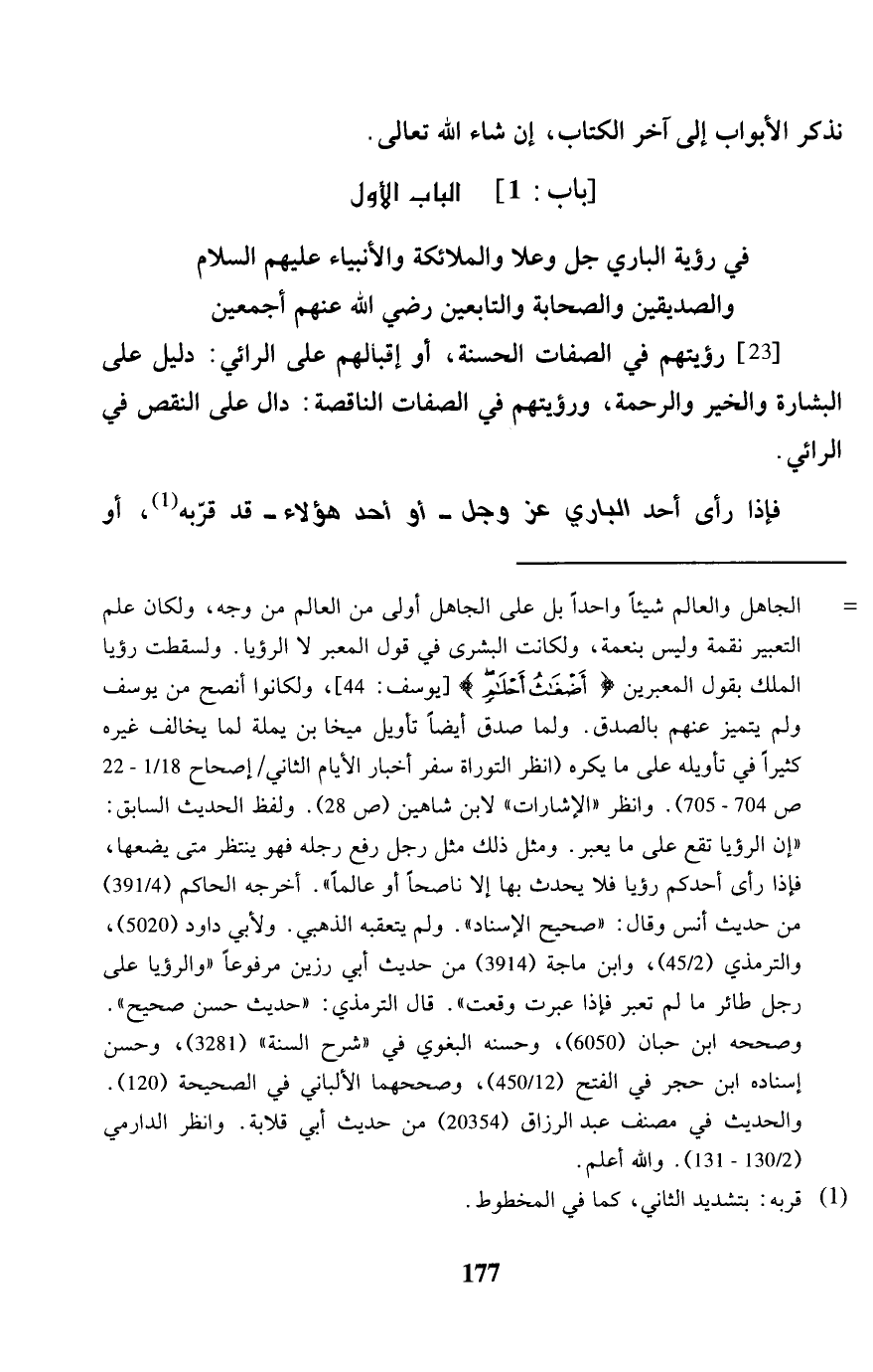 [23] رُؤْيَتهمْ فِي الصِّفَات الْحَسَنَة، أَو إقبالهم على الرَّائِي: دَلِيل على الْبشَارَة وَالْخَيْر وَالرَّحْمَة، ورؤيتهم فِي الصِّفَات النَّاقِصَة: دَال على النَّقْص فِي الرَّائِي. فَإِذا رأى أحد الْبَارِي عز وَجل - أَو أحد هَؤُلَاءِ - قد قربه، أَو