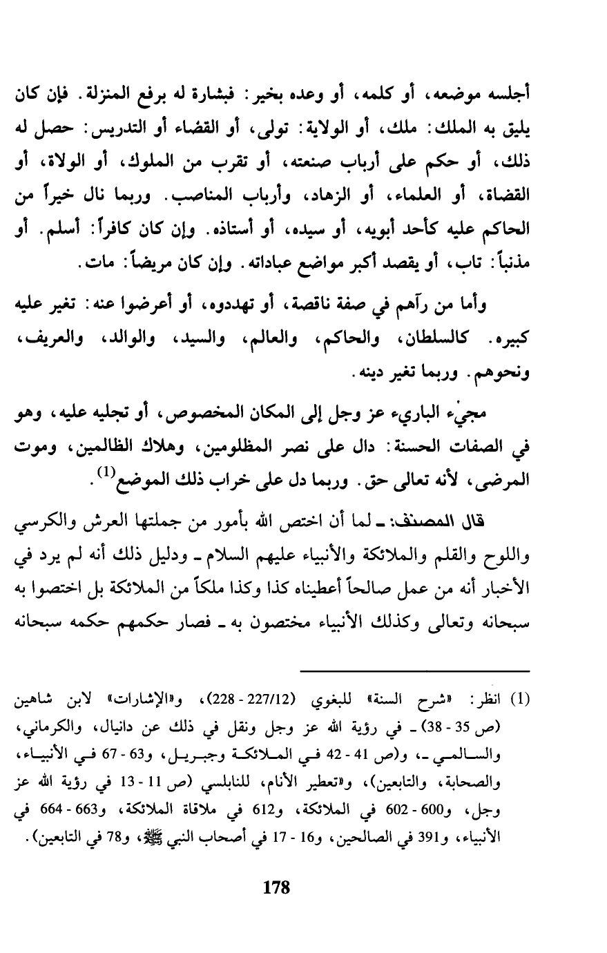 أجلسه مَوْضِعه، أَو كَلمه، أَو وعده بِخَير: فبشارة لَهُ بِرَفْع الْمنزلَة. فَإِن كَانَ يَلِيق بِهِ الْملك: ملك، أَو الْولَايَة: تولى، أَو الْقَضَاء أَو التدريس: حصل لَهُ ذَلِك، أَو حكم على أَرْبَاب صَنعته، أَو تقرب من الْمَمْلُوك، أَو الْولادَة، أَو الْقُضَاة، أَو الْعلمَاء، أَو الزهاد، أَو أَرْبَاب المناصب. وَرُبمَا نَالَ خيرا من الْحَاكِم عَلَيْهِ كَأحد أَبَوَيْهِ، أَو سَيّده، أَو أستاذه. وَإِن كَانَ كَافِرًا: أسلم. أَو مذنباً: تَابَ، أَو يقْصد أكبر مَوَاضِع عِبَادَته. وَإِن كَانَ مَرِيضا: مَاتَ. وَأما من رَآهُمْ فِي صفة نَاقِصَة، أَو تهددوه، أَو أَعرضُوا عَنهُ: تغير عَلَيْهِ كبيره. كالسلطان، وَالْحَاكِم، والعالم، وَالسَّيِّد، وَالْوَالِد، والعريف، وَنَحْوهم. وَرُبمَا تغير دينه. مَجِيء الباريء عز وَجل إِلَى الْمَكَان الْمَخْصُوص، أَو تجليه عَلَيْهِ، وَهُوَ فِي الصِّفَات الْحَسَنَة: دَال على نصر المظلومين، وهلاك الظَّالِمين، وَمَوْت المرضى، لِأَنَّهُ تَعَالَى حق. وَرُبمَا دلّ على خراب ذَلِك الْموضع. قَالَ المُصَنّف: - لما أَن اخْتصَّ الله بِأُمُور من جُمْلَتهَا الْعَرْش والكرسي واللوح والقلم وَالْمَلَائِكَة والأنبياء عَلَيْهِم السَّلَام - وَدَلِيل ذَلِك أَنه لم يرد فِي الْأَخْبَار أَنه من عمل صَالحا أعطيناه كَذَا وَكَذَا ملكا من الْمَلَائِكَة بل اختصوا بِهِ سُبْحَانَهُ وَتَعَالَى وَكَذَلِكَ الْأَنْبِيَاء مختصون بِهِ - فَصَارَ حكمهم حكمه سُبْحَانَهُ