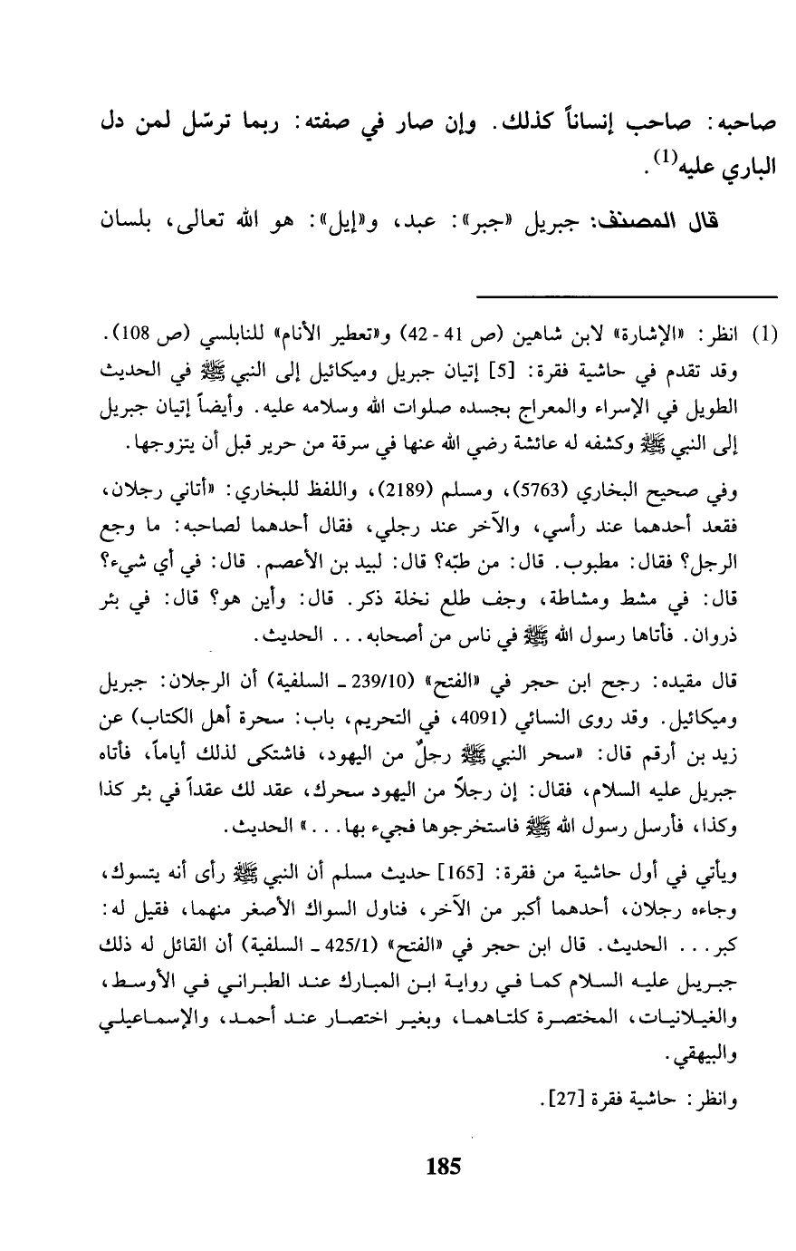 صَاحبه: صَاحب إنْسَانا كَذَلِك. وَإِن صَار فِي صفته: رُبمَا ترسل لمن دلّ الْبَارِي عَلَيْهِ. قَالَ المُصَنّف: جِبْرِيل " جبر ": عبد، و " إيل " هُوَ الله تَعَالَى، بِلِسَان