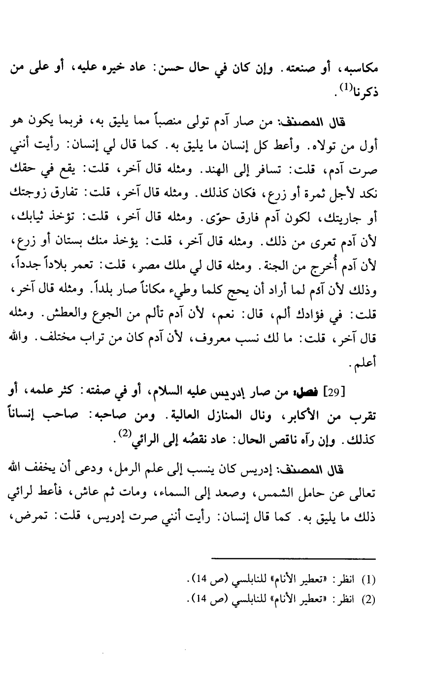 [29] فصل: من صَار إِدْرِيس عَلَيْهِ السَّلَام، أَو فِي صفته: كثر علمه، أَو تقرب من الأكابر، ونال الْمنَازل الْعَالِيَة. وَمن صَاحبه: صَاحب إنْسَانا كَذَلِك. وَإِن رَآهُ نَاقص الْحَال: عَاد نَقصه إِلَى الرَّائِي. قَالَ المُصَنّف: إِدْرِيس كَانَ ينْسب إِلَى علم الرمل، ودعى أَن يُخَفف الله تَعَالَى عَن حَامِل الشَّمْس، وَصعد إِلَى السَّمَاء، وَمَات ثمَّ عَاشَ، فأعط لرائي ذَلِك مَا يَلِيق بِهِ. كَمَا قَالَ إِنْسَان: رَأَيْت أنني صرت إِدْرِيس، قلت: تمرض،
