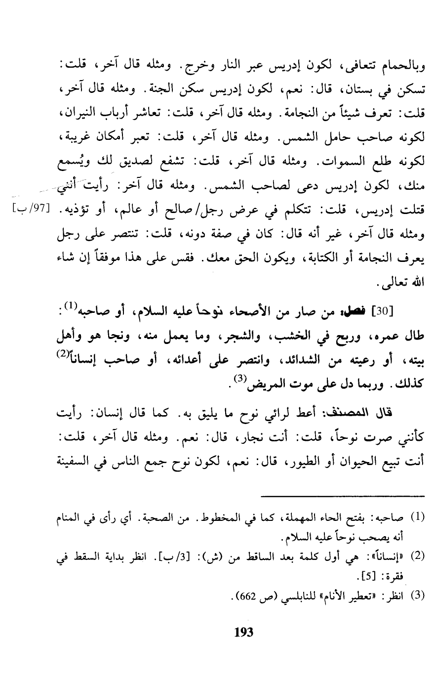 وبالحمام تتعافى، لكَون إِدْرِيس عبر النَّار وَخرج. وَمثله قَالَ آخر، قلت: تسكن فِي بُسْتَان، قَالَ: نعم، لكَون إِدْرِيس سكن الْجنَّة، وَمثله قَالَ آخر، قلت: تعرف شَيْئا من النجامة. وَمثله قَالَ آخر، قلت: تعاشر أَرْبَاب النيرَان، لكَونه صَاحب حَامِل الشَّمْس. وَمثله قَالَ آخر، قلت: تعبر أمكان غَرِيبَة، لكَونه طلع السَّمَوَات. وَمثله قَالَ آخر، قلت: تشفع لصديق لم وَيسمع مِنْك، لكَون إِدْرِيس دعى لصَاحب الشَّمْس. وَمثله قَالَ آخر: رَأَيْت أنني قتلت إِدْرِيس، قلت: تَتَكَلَّم فِي عرض رجل / صَالح أَو عَالم، أَو تؤذيه. وَمثله قَالَ آخر، غير أَنه قَالَ: كَانَ فِي صفة دونه، قلت: تنتصر على رجل يعرف النجامة أَو الْكِتَابَة، وَيكون الْحق مَعَك. فقس على هَذَا موقفا إِن شَاءَ الله تَعَالَى.