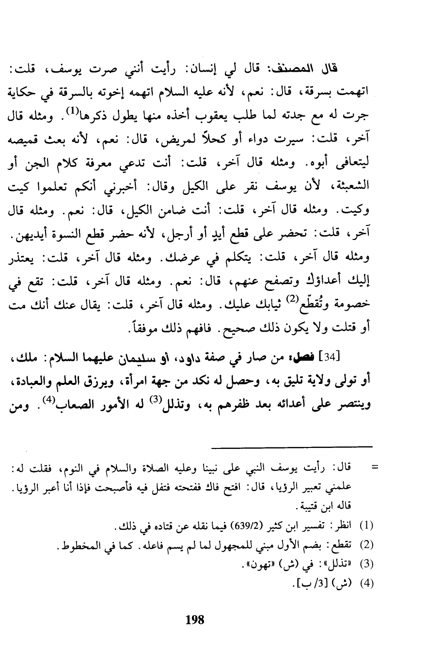 قَالَ المُصَنّف: قَالَ لي إِنْسَان: رَأَيْت أنني صرت يُوسُف، قلت: اتهمت بِسَرِقَة، قَالَ: نعم، لِأَنَّهُ عَلَيْهِ السَّلَام اتهمه إخْوَته بِالسَّرقَةِ فِي حِكَايَة جرت لَهُ مَعَ جدته لما طلب يَعْقُوب أَخذه مِنْهَا يطول ذكرهَا. وَمثله قَالَ آخر، قلت: سيرت دَوَاء أَو كحلاً لمريض، قَالَ: نعم، لِأَنَّهُ بعث قَمِيصه ليتعافى أَبوهُ. وَمثله قَالَ آخر، قلت: أَنْت تَدعِي معرفَة كَلَام الْجِنّ أَو الشعبثة، لِأَن يُوسُف نقر على الْكَيْل وَقَالَ: أَخْبرنِي أَنكُمْ تعلمُوا كَيْت وَكَيْت. وَمثله قَالَ آخر، قلت: أَنْت ضَامِن الْكَيْل، قَالَ: نعم. وَمثله قَالَ آخر، قلت: تحضر على قطع أيد أَو أرجل، لِأَنَّهُ حضر قطع النسْوَة أَيْدِيهنَّ. وَمثله قَالَ آخر، قلت: يتَكَلَّم فِي عرضك. وَمثله قَالَ آخر، قلت: يعْتَذر إِلَيْك أعداؤك وتصفح عَنْهُم، قَالَ: نعم. وَمثله قَالَ آخر، قلت: تقع فِي خُصُومَة وتقطع ثِيَابك عَلَيْك. وَمثله قَالَ آخر، قلت: يُقَال عَنْك أَنَّك مت أَو قتلت وَلَا يكون ذَلِك صَحِيح. فَافْهَم ذَلِك موفقاً.