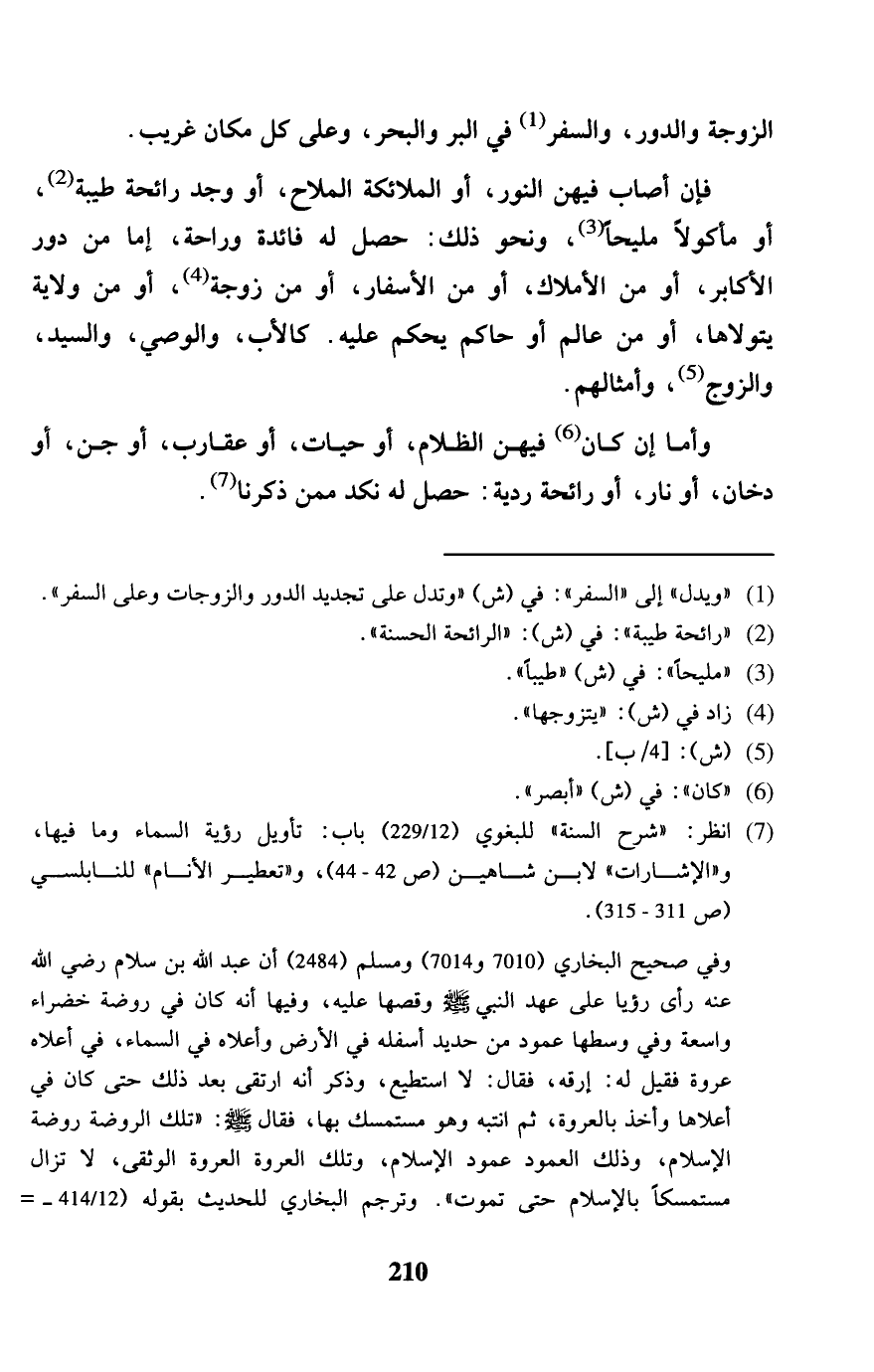 الزَّوْجَة والدور، وَالسّفر فِي الْبر وَالْبَحْر، وعَلى كل مَكَان غَرِيب. فَإِن أصَاب فِيهِنَّ النُّور، أَو الْمَلَائِكَة الملاح، أَو وجد رَائِحَة طيبَة، أَو مَأْكُولا مليحاً، وَنَحْو ذَلِك: حصل لَهُ فَائِدَة وراحة، إِمَّا من دور الأكابر، أَو من الْأَمْلَاك، أَو من الْأَسْفَار، أَو من زَوْجَة، أَو من ولَايَة يتولاها، أَو من عَالم أَو من حَاكم يحكم عَلَيْهِ. كَالْأَبِ، وَالْوَصِيّ، وَالسَّيِّد، وَالزَّوْج، وأمثالهم. وَأما إِن كَانَ فِيهِنَّ الظلام، أَو حيات، أَو عقارب، أَو جن، أَو دُخان، أَو نَار، أَو رَائِحَة ردية: حصل لَهُ نكد مِمَّن ذكرنَا.