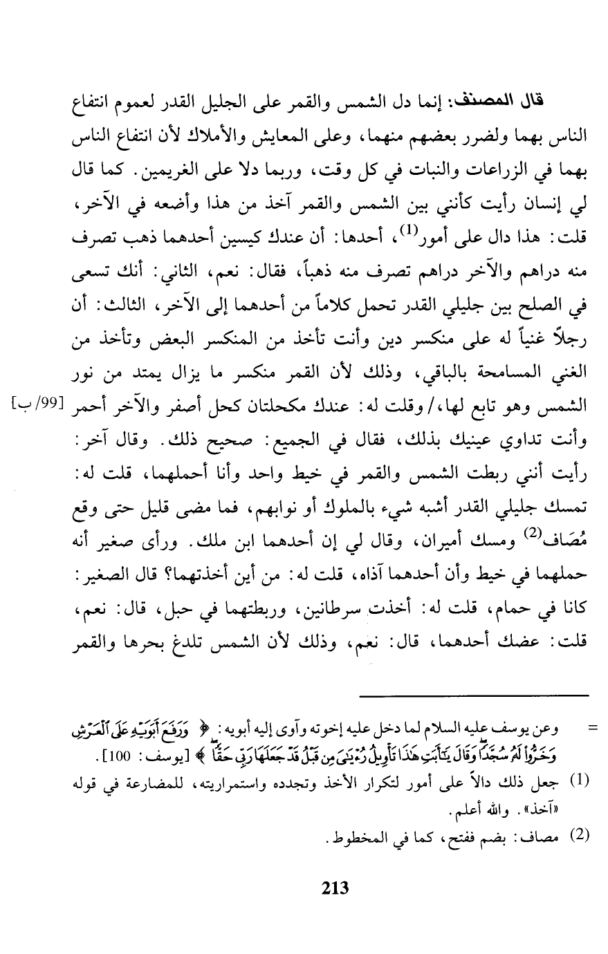 قَالَ المُصَنّف: إِنَّمَا دلّ الشَّمْس وَالْقَمَر على الْجَلِيل الْقدر لعُمُوم انْتِفَاع النَّاس بهما ولضرر بَعضهم مِنْهُمَا، وعَلى المعايش والأملاك لِأَن انْتِفَاع النَّاس بهما فِي الزراعات والنبات فِي كل وَقت، وَرُبمَا دلا على الغريمين. كَمَا قَالَ لي إِنْسَان رَأَيْت كأنني بَين الشَّمْس وَالْقَمَر آخذ من هَذَا وأضعه فِي الآخر، قلت: هَذَا دَال على أُمُور، أَحدهَا: أَن عنْدك كيسين أَحدهمَا ذهب تصرف مِنْهُ دَرَاهِم وَالْآخر دَرَاهِم تصرف مِنْهُ ذَهَبا، فَقَالَ: نعم، الثَّانِي: أَنَّك تسْعَى فِي الصُّلْح بَين جليلي الْقدر تحمل كلَاما من أَحدهمَا إِلَى الآخر، الثَّالِث: أَن رجلا غَنِيا لَهُ على منكسر دين وَأَنت تَأْخُذ من المنكسر الْبَعْض وَتَأْخُذ من الْغَنِيّ الْمُسَامحَة بِالْبَاقِي، وَذَلِكَ لِأَن الْقَمَر منكسر مَا يزَال يَمْتَد من نور الشَّمْس وَهُوَ تَابع لَهَا، / وَقلت لَهُ: عنْدك مكحلتان كحل أصفر وَالْآخر أَحْمَر وَأَنت تداوي عَيْنَيْك بذلك، فَقَالَ فِي الْجَمِيع: صَحِيح ذَلِك. وَقَالَ آخر: رَأَيْت أنني ربطت الشَّمْس وَالْقَمَر فِي خيط وَاحِد وَأَنا أحملهما، قلت لَهُ: تمسك جليلي الْقدر أشبه بالملوك أَو نوابهم، فَمَا مضى قَلِيل حَتَّى وَقع مصَاف ومسك أميران، وَقَالَ لي إِن أَحدهمَا ابْن مَالك. وَرَأى صَغِير أَنه حملهما فِي خيط وَأَن أَحدهمَا آذاه، قلت لَهُ: من أَيْن أخذتهما؟ قَالَ الصَّغِير: كَانَا فِي حمام، قلت لَهُ: أخذت سرطانين، وربطتهما فِي حَبل، قَالَ: نعم، قلت: عضك أَحدهمَا، قَالَ: نعم، وَذَلِكَ لِأَن الشَّمْس تلدغ بحرها وَالْقَمَر