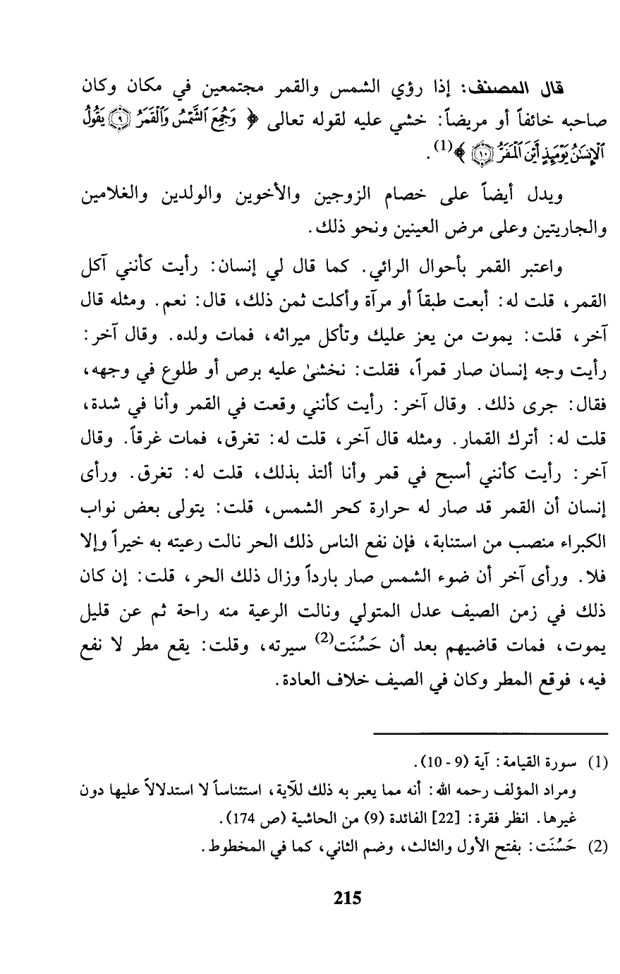 قَالَ المُصَنّف: إِذا رُؤِيَ الشَّمْس وَالْقَمَر مُجْتَمعين فِي مَكَان وَكَانَ صَاحبه خَائفًا أَو مَرِيضا: خشِي عَلَيْهِ لقَوْله تَعَالَى {وَجمع الشَّمْس وَالْقَمَر يَقُول الْإِنْسَان يَوْمئِذٍ أَيْن المفر} وَيدل أَيْضا على خصام الزَّوْجَيْنِ والأخوين والولدين والغلامين والجاريتين وعَلى مرض الْعَينَيْنِ وَنَحْو ذَلِك. وَاعْتبر الْقَمَر بأحوال الرَّائِي. كَمَا قَالَ لي إِنْسَان: رَأَيْت كأنني آكل الْقَمَر، قلت لَهُ: أبْعث طبقًا أَو مرْآة وأكلت ثمن ذَلِك، قَالَ: نعم. وَمثله قَالَ آخر، قلت: يَمُوت من يعز عَلَيْك وتأكل مِيرَاثه، فَمَاتَ وَلَده. وَقَالَ آخر: رَأَيْت وَجه إِنْسَان صَار قمراً، فَقلت: نخشى عَلَيْهِ برص أَو طُلُوع فِي وَجهه، فَقَالَ: جرى ذَلِك. وَقَالَ آخر: رَأَيْت كأنني وَقعت فِي الْقَمَر وَأَنا فِي شدَّة، قلت لَهُ: أترك الْقمَار. وَمثله قَالَ آخر، قلت لَهُ: تغرق، فَمَاتَ غرقاً. وَقَالَ آخر: رَأَيْت كأنني أسبح فِي قمر وَأَنا ألتذ بذلك، قلت لَهُ: تغرق. وَرَأى إِنْسَان أَن الْقَمَر قد صَار لَهُ حرارة كحر الشَّمْس، قلت: يتَوَلَّى بعض نواب الكبراء منصب من استنابة، فَإِن نفع النَّاس ذَلِك الْحر نَالَتْ رَعيته بِهِ خيرا وَإِلَّا فَلَا. وَرَأى آخر أَن ضوء الشَّمْس صَار بَارِدًا وَزَالَ ذَلِك الْحر، قلت: إِن كَانَ ذَلِك فِي زمن الصَّيف عدل الْمُتَوَلِي ونالت الرّعية مِنْهُ رَاحَة ثمَّ عَن قَلِيل يَمُوت، فَمَاتَ قاضيهم بعد أَن حسنت سيرته، وقلتك يَقع مطر لَا نفع فِيهِ، فَوَقع الْمَطَر وَكَانَ فِي الصَّيف خلاف الْعَادة.