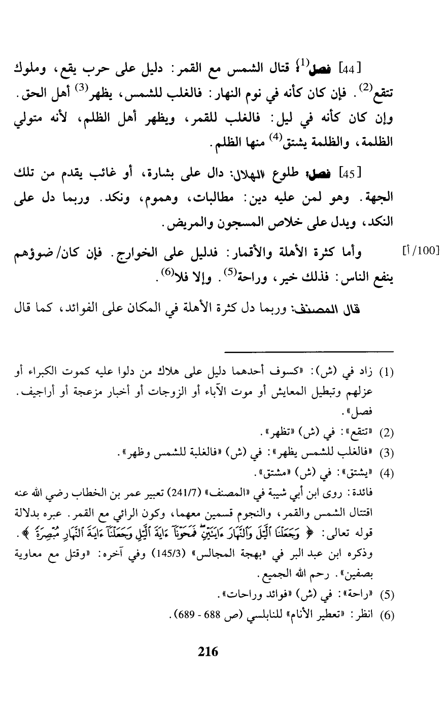 [44] فصل: قتال الشَّمْس مَعَ الْقَمَر: دَلِيل على حَرْب يَقع، وملوك تتقع. فَإِن كَانَ كَأَنَّهُ فِي نوم النَّهَار: فالغلب للشمس، يظْهر أهل الْحق. وَإِن كَانَ كَأَنَّهُ فِي ليل: فالغلب للقمر، وَيظْهر أهل الظُّلم، لِأَنَّهُ مُتَوَلِّي الظلمَة، والظلمة يشتق مِنْهَا الظُّلم.