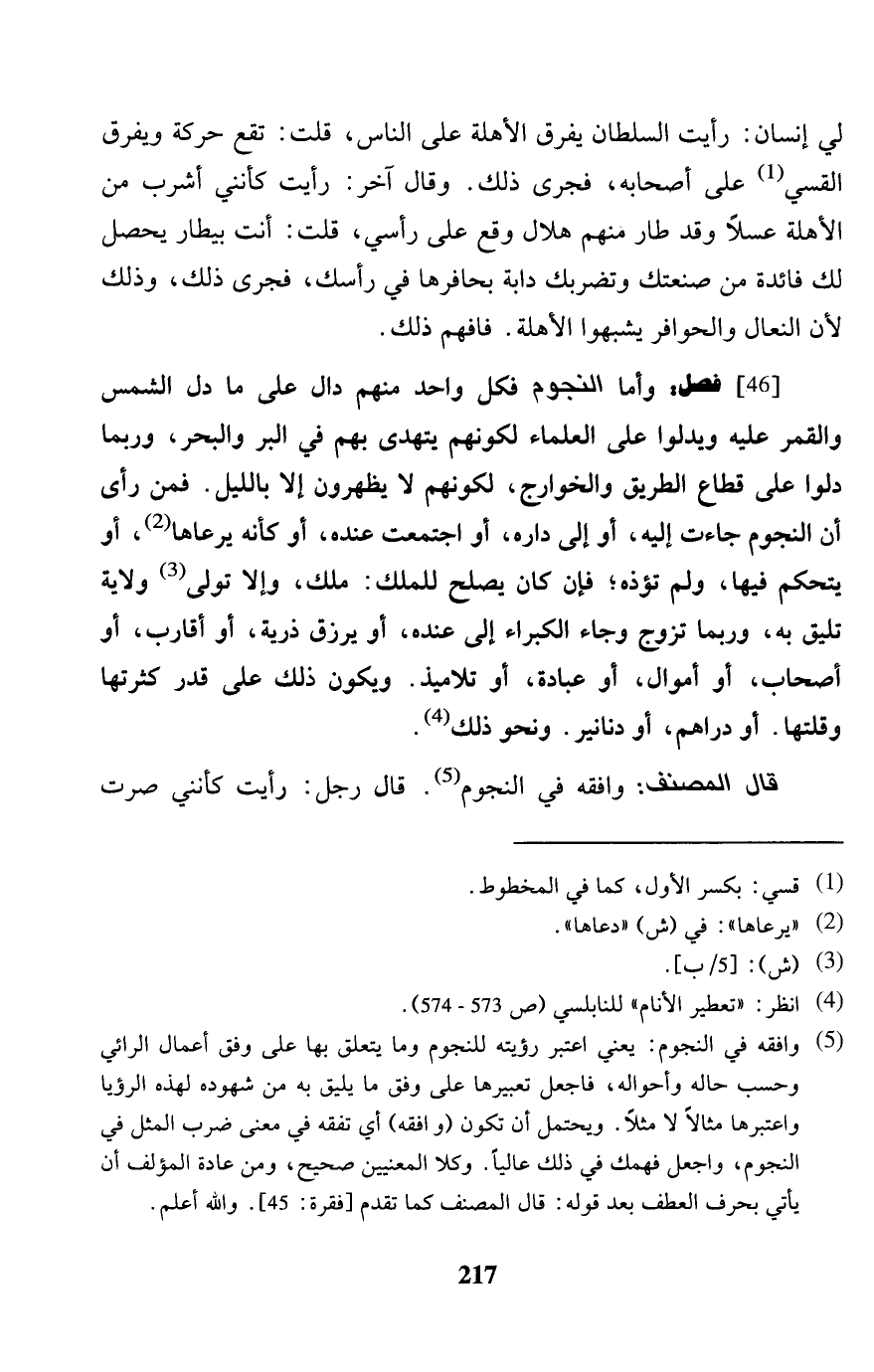 [46] فصل: وَأما النُّجُوم فَكل وَاحِد مِنْهُم دَال على مَا دلّ الشَّمْس وَالْقَمَر عَلَيْهِ ويدلوا على الْعلمَاء لكَوْنهم يتهدى بهم فِي الْبر وَالْبَحْر، وَرُبمَا دلوا على قطاع الطَّرِيق والخوارج، لكَوْنهم لَا يظهرون إِلَّا بِاللَّيْلِ. فَمن رأى أَن النُّجُوم جَاءَت إِلَيْهِ، أَو إِلَى دَاره، أَو اجْتمعت عِنْده، أَو كَأَنَّهُ يرعاها، أَو يتحكم فِيهَا، وَلم تؤذه؛ فَإِن كَانَ يصلح للْملك: ملك، وَإِلَّا تولى ولَايَة تلِيق بِهِ، وَرُبمَا تزوج وَجَاء الكبراء إِلَى عِنْده، أَو يرْزق ذُرِّيَّة، أَو أقَارِب، أَو أَصْحَاب، أَو أَمْوَال، أَو عبَادَة، أَو تلاميذ. وَيكون ذَلِك على قدر كثرتها وقلتها. أَو دَرَاهِم، أَو دَنَانِير. وَنَحْو ذَلِك. قَالَ المُصَنّف: وَافقه فِي النُّجُوم. قَالَ رجل: رَأَيْت كأنني صرت