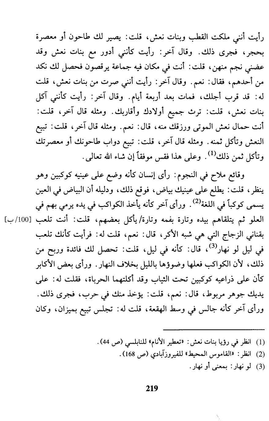 رَأَيْت أنني ملكت القطب وَبَنَات نعش، قلت: يصير لَك طاحون أَو معصرة بِحجر، فَجرى ذَلِك. وَقَالَ آخر: رَأَيْت كأنني أدور مَعَ بَنَات نعش وَقد عضني نجم مِنْهُنَّ، قلت: أَنْت فِي مَكَان فِيهِ جمَاعَة يرقصون فَحصل لَك نكد من أحدهم، فَقَالَ: نعم. وَقَالَ آخر: رَأَيْت أنني صرت من بَنَات نعش، قلت لَهُ: قد قرب أَجلك، فَمَاتَ بعد أَرْبَعَة أَيَّام. وَقَالَ آخر: رَأَيْت كأنني آكل بَنَات نعش، قلت: تَرث جَمِيع أولادك وأقاربك. وَمثله قَالَ آخر، قلت: أَنْت حمال نعش الْمَوْتَى ورزقك مِنْهُ، قَالَ: نعم. وَمثله قَالَ آخر، قلت: تبيع النعش وتأكل ثمنه. وَمثله قَالَ آخر، قلت: تبيع دَوَاب طاحونك أَو معصرتك وتأكل ثمن ذَلِك. وعَلى هَذَا فقس موفقاً إِن شَاءَ الله تَعَالَى. وقائع ملاح فِي النُّجُوم: رأى إِنْسَان كَأَنَّهُ وضع على عَيْنَيْهِ كوكبين وَهُوَ ينظر، قلت: يطلع على عَيْنَيْك بَيَاض، فَوَقع ذَلِك، وَدَلِيله أَن الْبيَاض فِي الْعين يُسمى كوكباً فِي اللُّغَة. وَرَأى آخر كَأَنَّهُ يَأْخُذ الْكَوَاكِب فِي يَده يَرْمِي بهم فِي الْعُلُوّ ثمَّ يتلقاهم بِيَدِهِ. وَتارَة بفهمه وَتارَة / يَأْكُل بَعضهم، قلت: أَنْت تلعب بقناني الزّجاج الَّتِي هِيَ شبه الأكر، قَالَ: نعم، قلت لَهُ: فَرَأَيْت كَأَنَّك تلعب فِي ليل لَو نهر، قَالَ: كَأَنَّهُ فِي ليل، قلت: تحصل لَك فَائِدَة وَربح من ذَلِك، لِأَن الْكَوَاكِب فعلهَا وضوؤها بِاللَّيْلِ بِخِلَاف النَّهَار. وَرَأى بعض الأكابر كَأَن على ذِرَاعَيْهِ كوكبين تَحت الثِّيَاب وَقد أكلتهما الحرباة، فَقلت لَهُ: على يَديك جَوْهَر مربوط، قَالَ: نعم، قلت: يُؤْخَذ مِنْك فِي حَرْب، فَجرى ذَلِك. وَرَأى آخر كَأَنَّهُ جَالس فِي وسط الهقعة، قلت لَهُ: تجْلِس تبيع بميزان، وَكَانَ