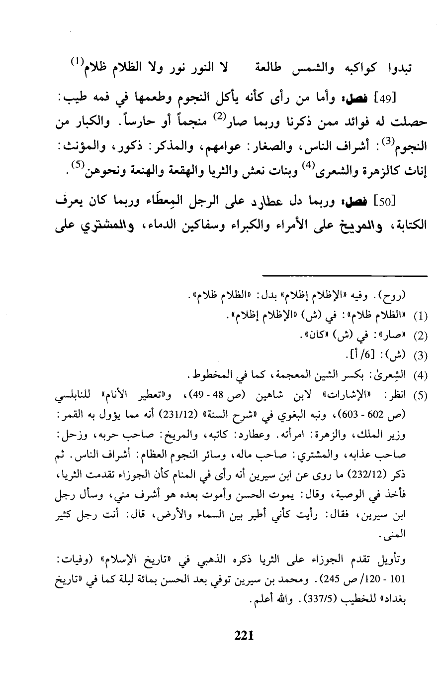 [49] فصل: وَأما من رأى كَأَنَّهُ يَأْكُل النُّجُوم وطعمها فِي فهمه طيب: حصلت لَهُ فَوَائِد مِمَّن ذكرنَا وَرُبمَا صَار منجماً أَو حارساً. والكبار من النُّجُوم: أشرف النَّاس، وَالصغَار: عوامهم، والمذكر: ذُكُور، والمؤنث: إناث كالزهرة والشعرى وَبَنَات نعش والثريا والهقعة والهنعة ونحوهن.