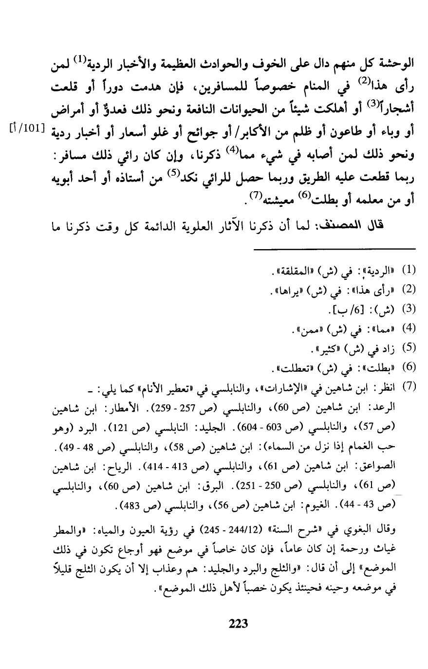 الوحشة كل مِنْهُم دَال على الْخَوْف والحوادث الْعَظِيمَة وَالْأَخْبَار الردية لمن رأى هَذَا فِي الْمَنَام خُصُوصا للمسافرين، فَإِن هدمت دوراً أَو قلعت أشجاراً، أَو أهلكت شَيْئا من الْحَيَوَانَات النافعة وَنَحْو ذَلِك فعدو أَو أمراض أَو وباء أَو طاعون أَو ظلم من الأكابر / أَو جوائح أَو غلو أسعار أَو أَخْبَار ردية وَنَحْو ذَلِك لمن أَصَابَهُ فِي شَيْء مِمَّا ذكرنَا وَإِن كَانَ رائي ذَلِك مُسَافر: رُبمَا قطعت عَلَيْهِ الطَّرِيق وَرُبمَا حصل للرائي نكد من أستاذه أَو أحد أَبَوَيْهِ أَو من معلمه أَو بطلت معيشته. قَالَ المُصَنّف: لما أَن ذكرنَا الْآثَار العلوية الدائمة كل وَقت ذكرنَا مَا
