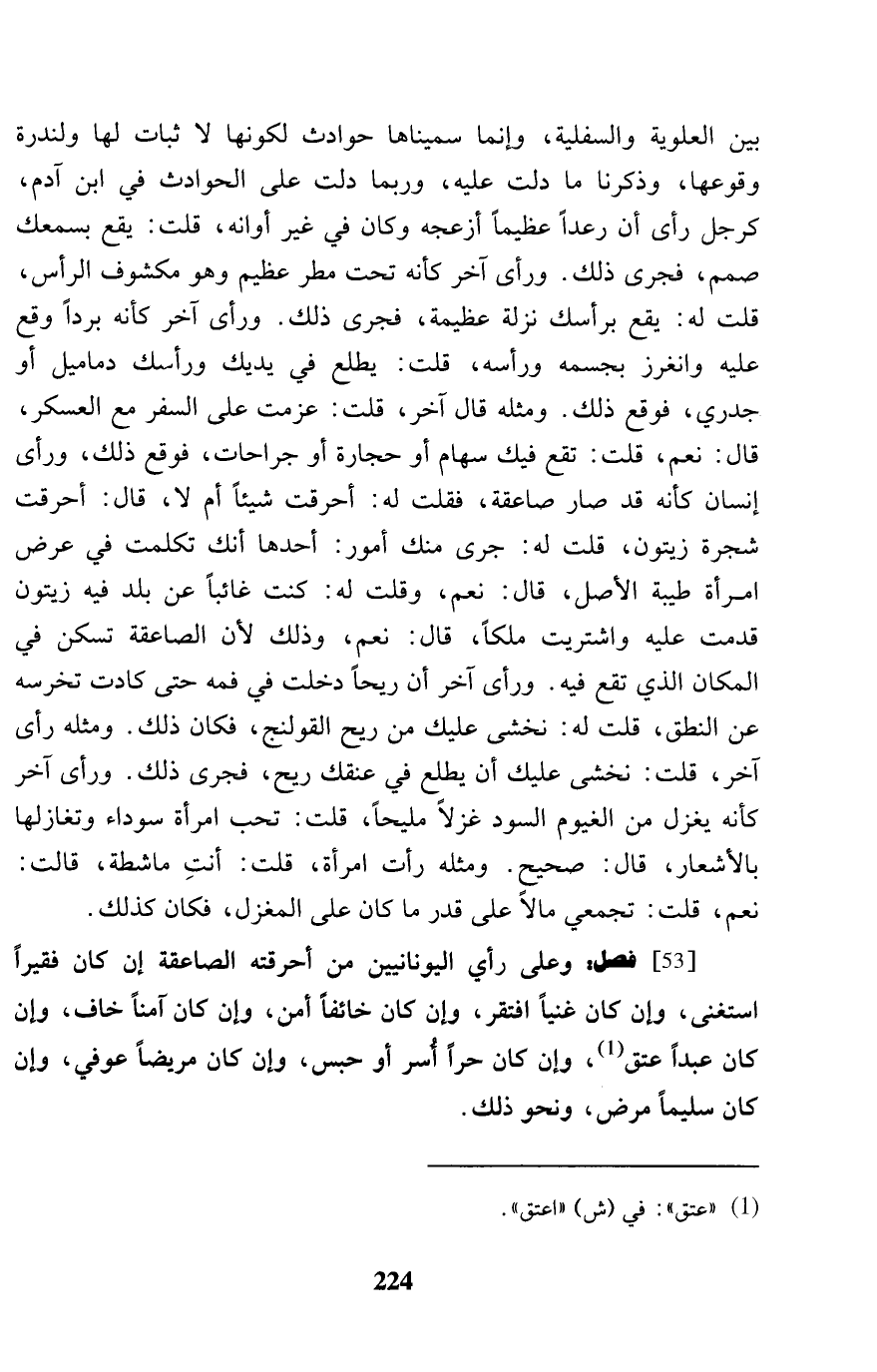 [53] فصل: وعَلى رَأْي اليونانيين من أحرقته الصاعقة إِن كَانَ فَقِيرا اسْتغنى، وَإِن كَانَ غَنِيا افْتقر، وَإِن كَانَ خَائفًا أَمن، وغن كَانَ آمنا خَافَ، وَإِن كَانَ عبدا عتق، وَإِن كَانَ حرا أسر أَو حبس، وَإِن كَانَ مَرِيضا عوفي، وَإِن كَانَ سليما مرض، وَنَحْو ذَلِك.