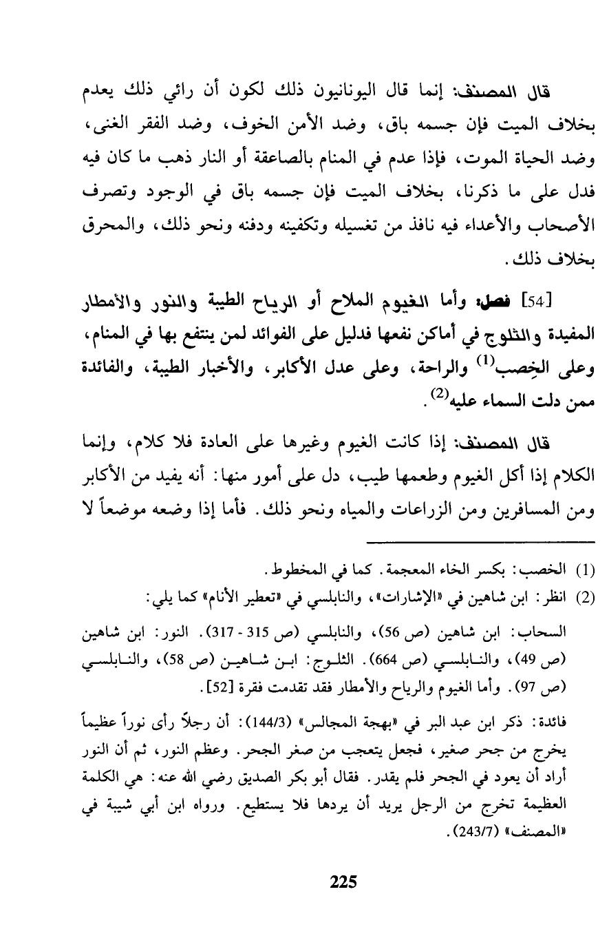 [54] فصل: وَأما الغيوم الملاح أَو الرِّيَاح الطّيبَة والنور والأمطار المفيدة والثلوج فِي أَمَاكِن نَفعهَا فدليل على الْفَوَائِد لمن ينْتَفع بهَا فِي الْمَنَام، وعَلى الخصب والراحة، وعَلى عدل الأكابر، وَالْأَخْبَار الطّيبَة، والفائدة مِمَّن دلّت السَّمَاء عَلَيْهِ. قَالَ المُصَنّف: إِذا كَانَت الغيوم وَغَيرهَا على الْعَادة فَلَا كَلَام، وَإِنَّمَا الْكَلَام إِذا أكل الغيوم وطعمها طيب، دلّ على أُمُور مِنْهَا: أَنه يُفِيد من الأكابر وَمن الْمُسَافِرين وَمن الزراعات والمياه وَنَحْو ذَلِك. فَأَما إِذا وَضعه موضعا لَا