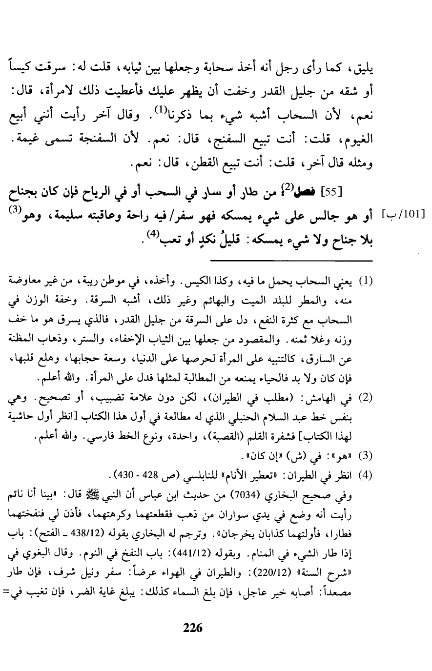 [55] فصل: من طَار أَو سَار فِي السحب أَو فِي الرِّيَاح فَإِن كَانَ بجناح أَو هُوَ جَالس على شَيْء يمسِكهُ فَهُوَ سفر / فِيهِ رَاحَة وعاقبته سليمَة، وَهُوَ بِلَا جنَاح وَلَا شَيْء يمسِكهُ: قَلِيل نكد أَو تَعب.