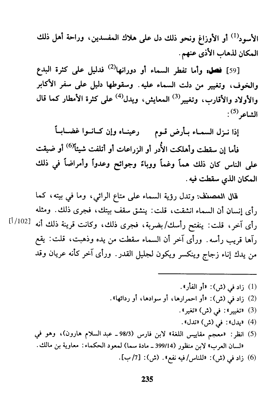 [59] فصل: وَأما تفطر السَّمَاء أَو دورانها فدليل على كَثْرَة الْبدع وَالْخَوْف، وتغيير من دلّت السَّمَاء عَلَيْهِ. وسقوطها دَلِيل على سفر الأكابر وَالْأَوْلَاد والأقارب، وتغيير المعايش، وَيدل على كَثْرَة الأمطار كَمَا قَالَ الشَّاعِر: