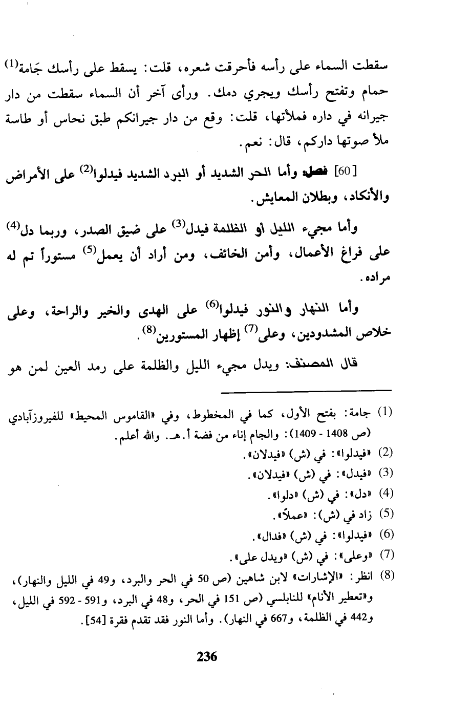 [60] فصل: وَأما الْحر الشَّديد أَو الْبرد الشَّديد فيدلوا على الْأَمْرَاض والأنكاد، وَبطلَان المعايش. وَأما مَجِيء اللَّيْل أَو الظلمَة فَيدل على ضيق الصَّدْر، وَرُبمَا دلّ على فرَاغ الْأَعْمَال، وَأمن الْخَائِف، وَمن أَرَادَ أَن يعْمل مَسْتُورا تمّ لَهُ مُرَاده. وَأما النَّهَار والنور فيدلوا على الْهدى وَالْخَيْر والراحة، وعَلى خلاص المشدودين، وعَلى إِظْهَار المستورين. قَالَ المُصَنّف: وَيدل مَجِيء اللَّيْل والظلمة على رمد الْعين لمن هُوَ