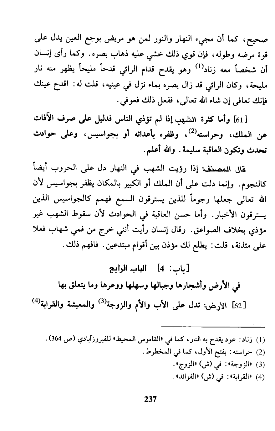 [61] وَأما كَثْرَة الشهب إِذا لم تؤذي النَّاس فدليل على صرف الْآفَات عَن الْملك، وحراسته، وظفره بأعدائه أَو بجواسيس، وعَلى حوادث تحدث وَتَكون الْعَاقِبَة سليمَة. وَالله أعلم. قَالَ المُصَنّف: إِذا رؤيت الشهب فِي النَّهَار دلّ على الحروب أَيْضا كَالنُّجُومِ. وَإِنَّمَا دلّت على أَن الْملك أَو الْكَبِير بِالْمَكَانِ يظفر بجواسيس لِأَن الله تَعَالَى جعلهَا رجوماً للَّذين يسْتَرقونَ السّمع فهمم كالجواسيس الَّذين يسْتَرقونَ الْأَخْبَار. وَأما حسن الْعَاقِبَة فِي الْحَوَادِث لِأَن سُقُوط الشهب غير مؤذي بِخِلَاف الصَّوَاعِق. وَقَالَ إِنْسَان رَأَيْت أنني خرج من فمي شهَاب فعلا على مئذنة، قلت: يطلع لَك مُؤذن بَين أَقوام مبتدعين. فَافْهَم ذَلِك.