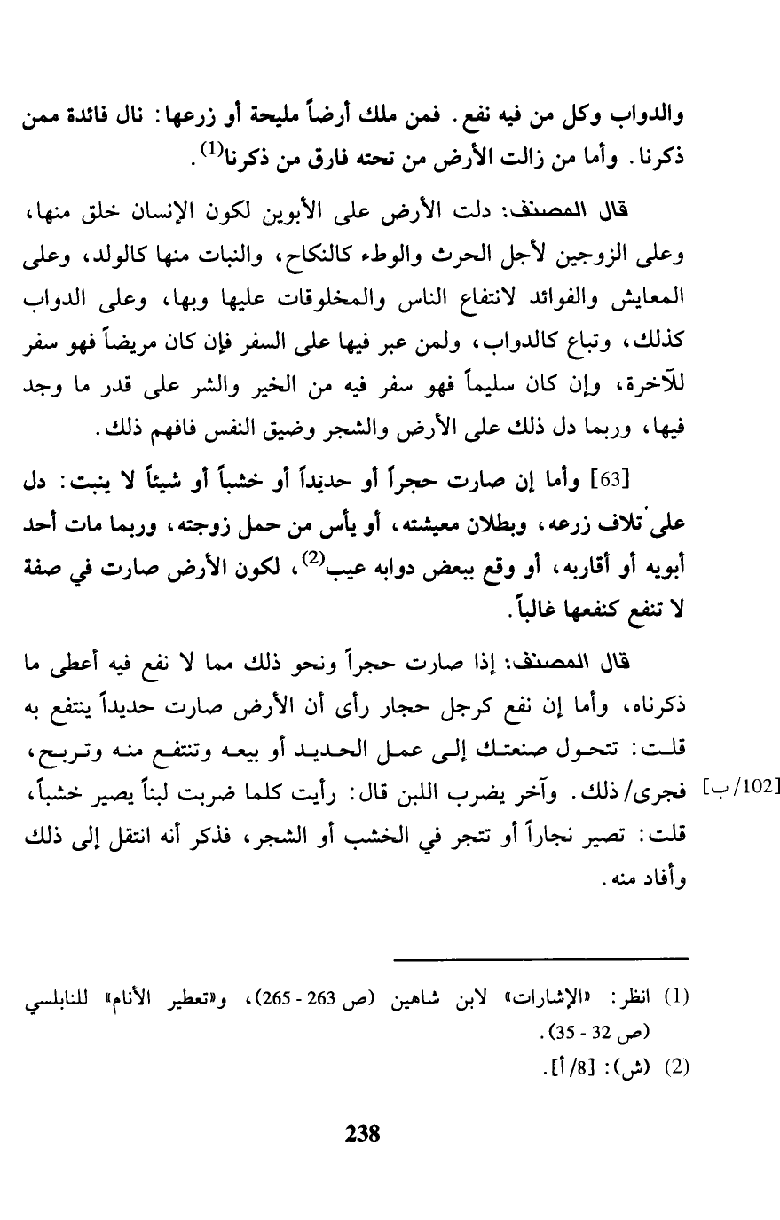 وَالدَّوَاب وكل من فِيهِ نفع. فَمن ملك أَرضًا مليحة أَو زَرعهَا: نَالَ فَائِدَة مِمَّن ذكرنَا. وَأما من زَالَت الأَرْض من تَحْتَهُ فَارق من ذكرنَا. قَالَ المُصَنّف: دلّت الأَرْض على الْأَبَوَيْنِ لكَون الْإِنْسَان خلق مِنْهَا، وعَلى الزَّوْجَيْنِ لأجل الْحَرْث وَالْوَطْء كَالنِّكَاحِ، والنبات مِنْهَا كَالْوَلَدِ، وعَلى المعايش والفوائد لانتفاع النَّاس والمخلوقات عَلَيْهَا وَبهَا، وعَلى الدَّوَابّ كَذَلِك، وتباع كالدواب، وَلمن عبر فِيهَا على السّفر فَإِن كَانَ مَرِيضا فَهُوَ سفر للآخرة، وَإِن كَانَ سليما فَهُوَ سفر فِيهِ من الْخَيْر وَالشَّر على قدر مَا وجد فِيهَا، وَرُبمَا دلّ ذَلِك على الأَرْض وَالشَّجر وضيق النَّفس فَافْهَم ذَلِك.