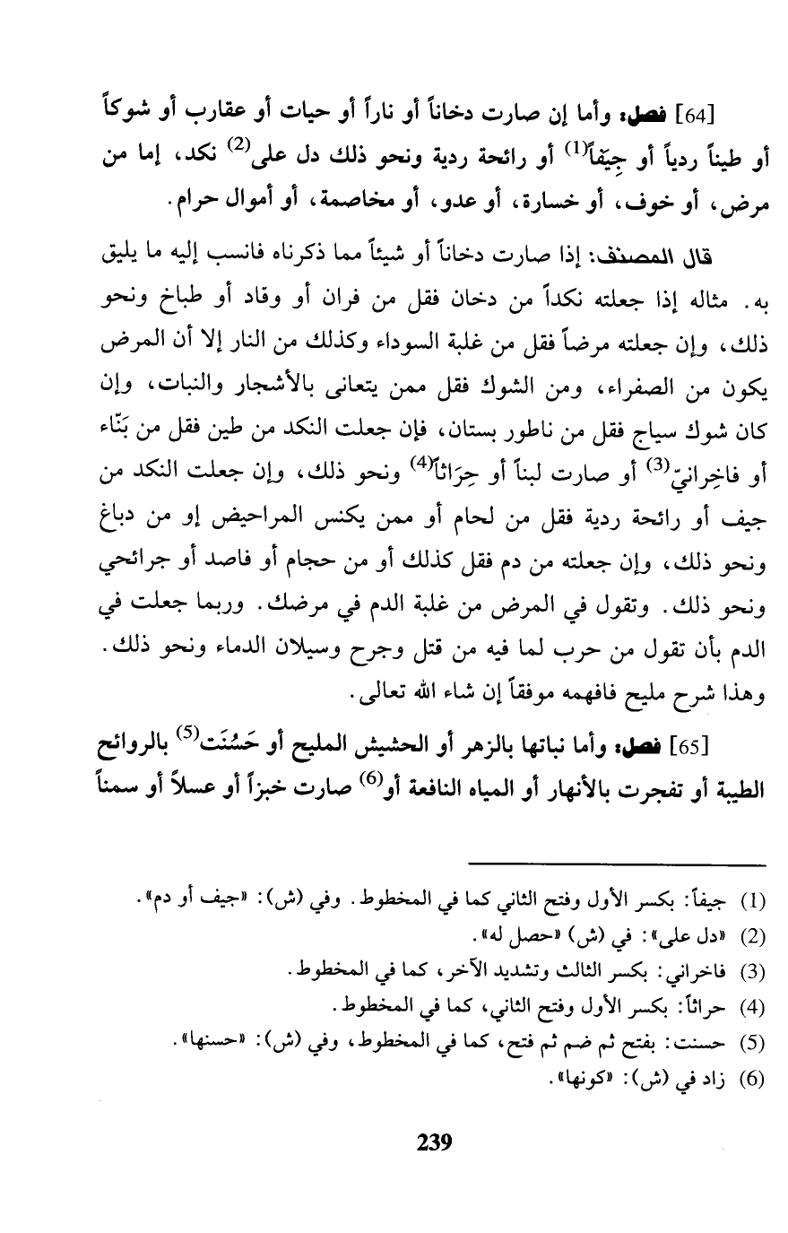 [64] فصل: وَأما إِن صَارَت دخاناً أَو نَارا أَو حيات أَو عقارب أَو شوكاً أَو طيناً ردياً أَو جيفاً أَو رَائِحَة ردية وَنَحْو ذَلِك دلّ على نكد، إِنَّمَا من مرض، أَو خوف، أَو خسارة، أَو عَدو، أَو مخاصمة، أَو أَمْوَال حرَام. قَالَ المُصَنّف: إِذا صَارَت دخاناً أَو شَيْئا مِمَّا ذَكرْنَاهُ فانسب إِلَيْهِ مَا يَلِيق بِهِ. مِثَاله إِذا جعلته نكداً من دُخان فَقل من فران أَو وقاد أَو طباخ وَنَحْو ذَلِك، وَإِن جعلته مَرضا فَقل من غَلَبَة السَّوْدَاء وَكَذَلِكَ من النَّار إِلَّا أَن الْمَرَض يكون من الصَّفْرَاء، وَمن الشوك فَقل مِمَّن يتعانى بالأشجار والنبات، وَإِن كَانَ شوك سياج فَقل من ناطور بُسْتَان، فَإِن جعلت النكد من طين فَقل من بِنَاء أَو فاخراني أَو صَارَت لَبَنًا أَو حراثاً وَنَحْو ذَلِك، وَإِن جعلت النكد من جيف أَو رَائِحَة ردية فَقل من لحام أَو مِمَّن يكنس المراحيض أَو من دباغ وَنَحْو ذَلِك، وَإِن جعلته من دم فَقل كَذَلِك أَو من حجام أَو فاصد أَو جرائحي وَنَحْو ذَلِك. وَتقول فِي الْمَرَض من غَلَبَة الدَّم فِي مرضك. وَرُبمَا جعلت فِي الدَّم بِأَن تَقول من حَرْب لما فِيهِ من قتل وجرح وسيلان الدِّمَاء وَنَحْو ذَلِك. وَهَذَا شرح مليح فافهمه موفقاً إِن شَاءَ الله تَعَالَى.
