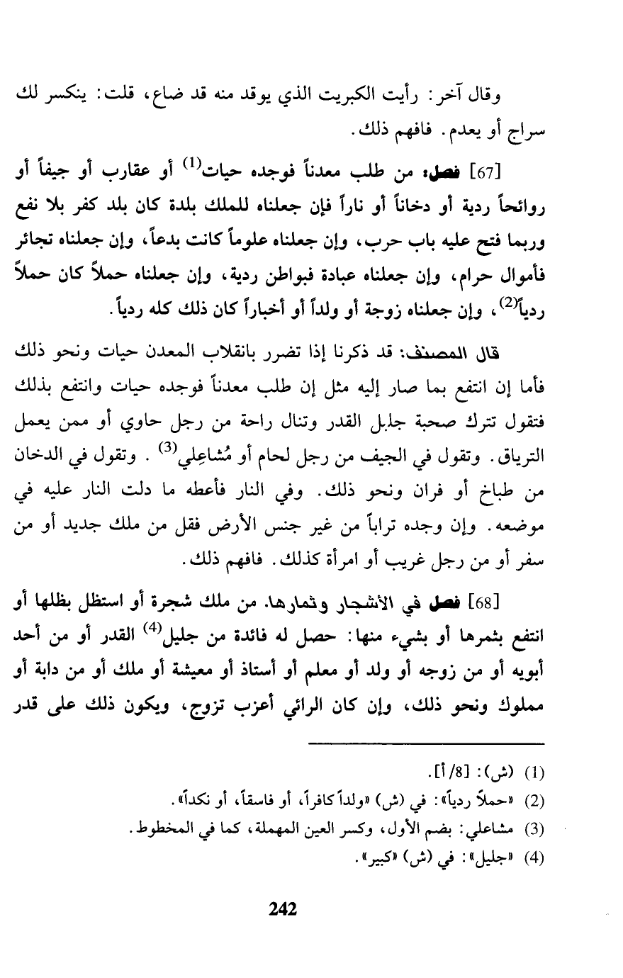 [67] فصل: من طلب معدناً فَوَجَدَهُ حيات أَو عقارب أَو جيفاً أَو روائحاً ردية أَو دخاناً أَو نَارا فَإِن جَعَلْنَاهُ للْملك بَلْدَة كَانَ بلد كفر بِلَا نفع وَرُبمَا فتح عَلَيْهِ بَاب حَرْب، وَإِن جَعَلْنَاهُ علوماً كَانَت بدعاً، وَإِن جَعَلْنَاهُ تجائر فأموال حرَام، وَإِن جَعَلْنَاهُ عبَادَة فبواطن ردية، وَإِن جَعَلْنَاهُ حملا كَانَ حملا ردياً، وَإِن جَعَلْنَاهُ زَوْجَة أَو ولدا أَو أَخْبَارًا كَانَ ذَلِك كُله ردياً. قَالَ المُصَنّف: قد ذكرنَا إِذا تضرر بانقلاب الْمَعْدن حيات وَنَحْو ذَلِك فَأَما إِن انْتفع بِمَا صَار إِلَيْهِ مثل إِن طلب معدناً فَوَجَدَهُ حيات وانتفع بذلك فَتَقول تتْرك صُحْبَة جليل الْقدر وتنال رَاحَة من رجل حاوي أَو مِمَّن يعْمل الترياق. وَتقول فِي الْجِيَف من رجل لحام أَو مشاعلي. وَتقول فِي الدُّخان من طباخ أَو فران وَنَحْو ذَلِك. وَفِي النَّار فأعطه مَا دلّت النَّار عَلَيْهِ فِي مَوْضِعه. وَإِن وجده تُرَابا من غير جنس الأَرْض فَقل من ملك جَدِيدَة أَو من سفر أَو من رجل غَرِيب أَو امْرَأَة كَذَلِك. فَافْهَم ذَلِك.