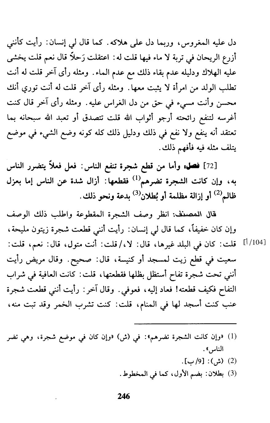 [72] فصل: وَأما من قطع شَجَرَة تَنْفَع النَّاس: فعل فعلا يتَضَرَّر النَّاس بِهِ، وَإِن كَانَت الشَّجَرَة تَضُرهُمْ فقطعها: أَزَال شدَّة عَن النَّاس إِمَّا بعزل ظَالِم أَو إِزَالَة مظْلمَة أَو بطلَان بِدعَة وَنَحْو ذَلِك. قَالَ المُصَنّف: انْظُر وصف الشَّجَرَة المقطوعة واطلب ذَلِك الْوَصْف وَإِن كَانَ خَفِيفا، كَمَا قَالَ لي إِنْسَان: رَأَيْت أنني قطعت شَجَرَة زيتون مليحة، قلت: كَانَ فِي الْبَلَد غَيرهَا، قَالَ: لَا، / قلت: أَنْت متول، قَالَ: نعم، قلت: سعيت فِي قطع زَيْت لمَسْجِد أَو كَنِيسَة، قَالَ: صَحِيح. وَقَالَ مَرِيض رَأَيْت أنني تَحت شَجَرَة تفاح أستظل بظلها فقطعتها، قلت: كَانَت الْعَافِيَة فِي شراب التفاح فَكيف قطعته! فَعَاد إِلَيْهِ، فَعُوفِيَ. وَقَالَ آخر: رَأَيْت أنني قطعت شَجَرَة عِنَب كنت أَسجد لَهَا فِي الْمَنَام، قلت: كنت تشرب الْخمر وَقد تبت مِنْهُ،