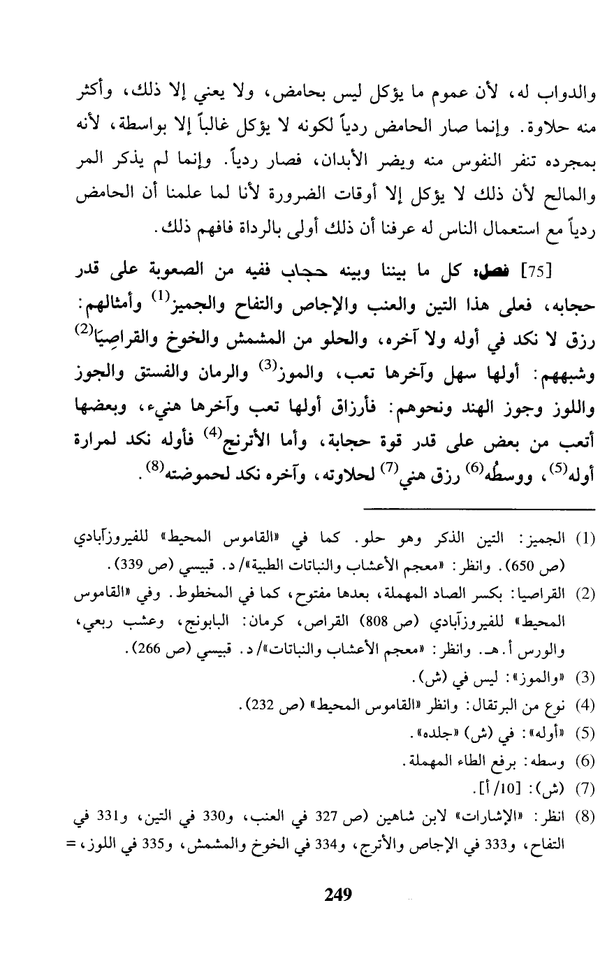 [75] فصل: كل مَا بَيْننَا وَبَينه حجاب فَفِيهِ من الصعوبة على قدر حجابه، فعلى هَذَا التِّين وَالْعِنَب والإجاص والتفاح والجميز وأمثالهم: رزق لَا نكد فِي أَوله وَلَا آخِره، والحلو من المشمش والخوخ والقراصيا وشبههم: أَولهَا سهل وَآخِرهَا تَعب والموز وَالرُّمَّان والفستق والجوز واللوز وَجوز الْهِنْد وَنَحْوهم: فأرزاق أَولهَا تَعب وَآخِرهَا هنيء، وَبَعضهَا أتعب من بعض على قدر قُوَّة حجابة، وَأما الأترنج فأوله نكد لمرارة أَوله ووسطه رزق هني لحلاوته، وَآخره نكد لحموضته.